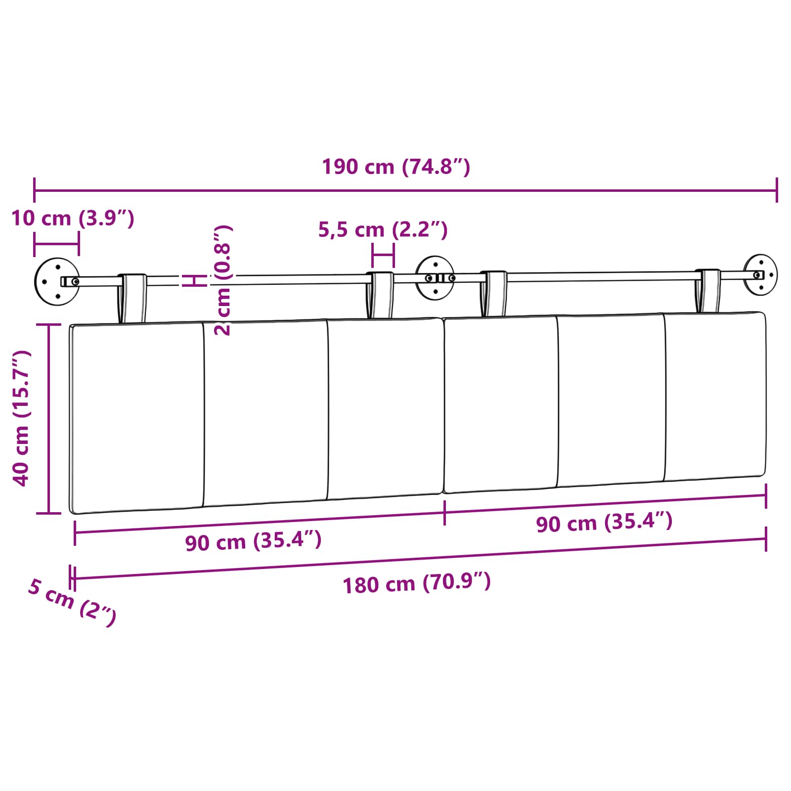 - Gesamtabmessungen: 190 x 55 x 5 cm (B x T x H)