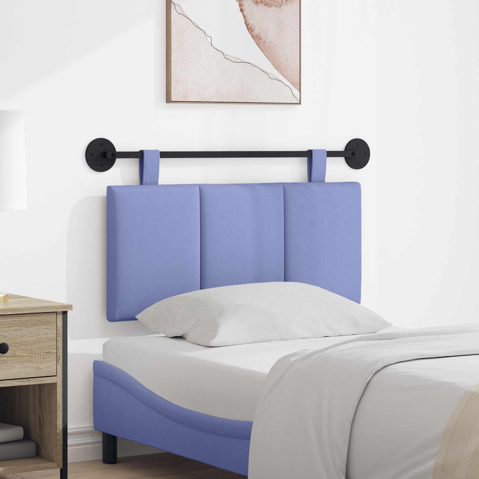 Dieses tolle Hängestück bringt moderne Einfachheit und Funktionalität zusammen. Mit seinem schlichten, rechteckigen Design und den eleganten Streifen peppt es jedes Schlafzimmer auf. Die weiche, gepolsterte Oberfläche lädt zum Entspannen ein – perfekt, um gemütlich zu sitzen oder zu lesen. Ideal für alle, die schicke Eleganz ohne viel Schnickschnack mögen. Es fügt sich harmonisch in verschiedene Inneneinrichtungen ein und bringt deine Schlafumgebung zum Strahlen. Elegante Stoffoberfläche Hergestellt aus 100% Polyester, bietet dieses Kopfteil atmungsaktiven Stoff für dauerhaften Komfort. Der Stoff hält lange und bleibt weich – perfekt für ein schickes Schlafzimmer. Integriertes Montagesystem Mit einer stabilen Metallleiste und Montagematerial für einfache Installation an der Wand. So sorgt es für einen sauberen, modernen Look, der den Platz optimal nutzt. Verstellbare Gurte Die abnehmbaren Gurte geben dir die Freiheit, das Kopfteil flexibel zu positionieren, je nach deinem Raum und deinen Wünschen. Weiche Polsterung Der Schaumkern sorgt für einen bequemen Sitz, perfekt zum Entspannen und Lesen. Damit unterstützt es ergonomisches Wohlbefinden. Einfacher Pflegeaufwand Zum Saubermachen reicht ein trockenes Tuch. Das macht die Pflege kinderleicht, ohne aggressive Reinigungsmittel einsetzen zu müssen.