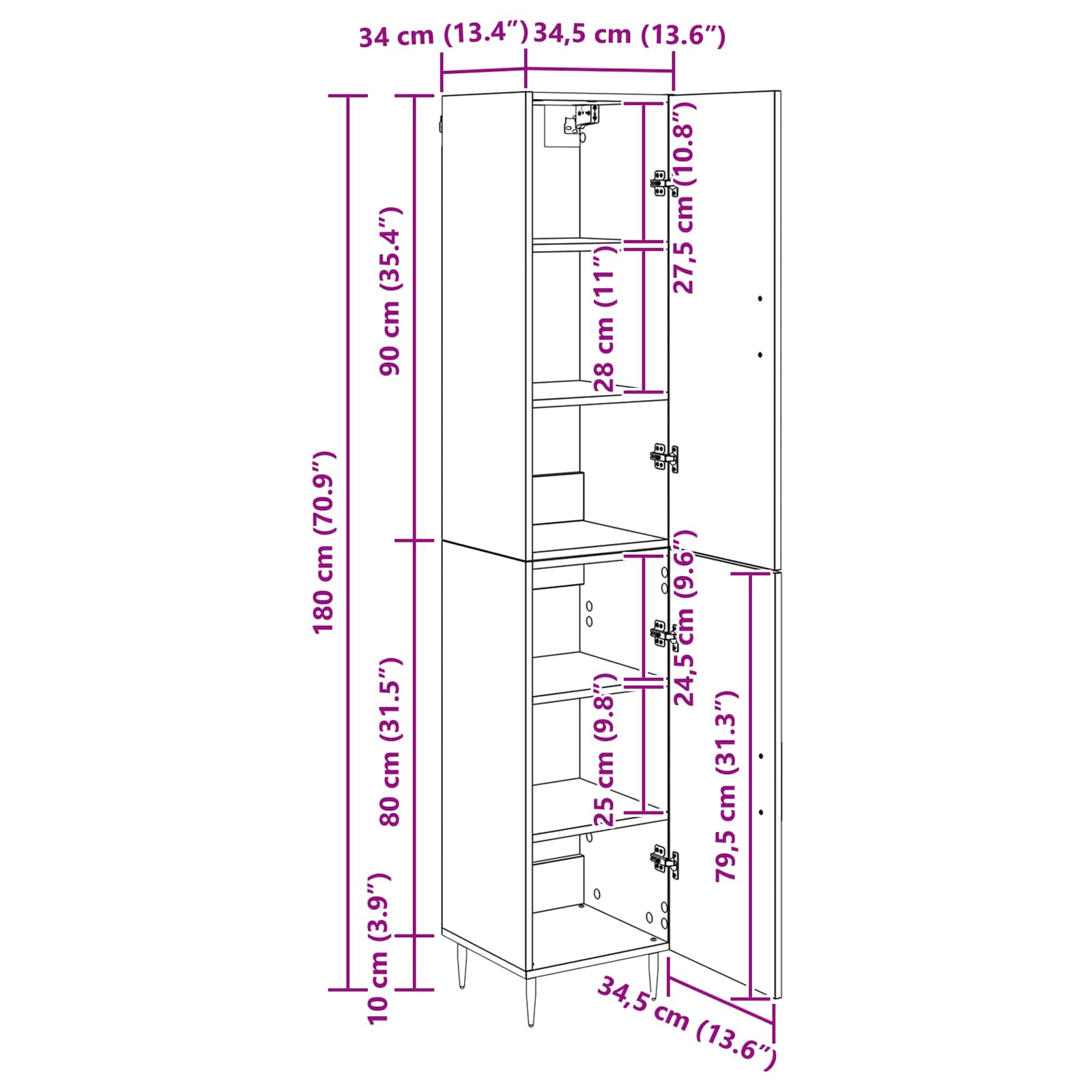 - Gesamtabmessungen: 34,5 x 34 x 180 cm (L x B x H)