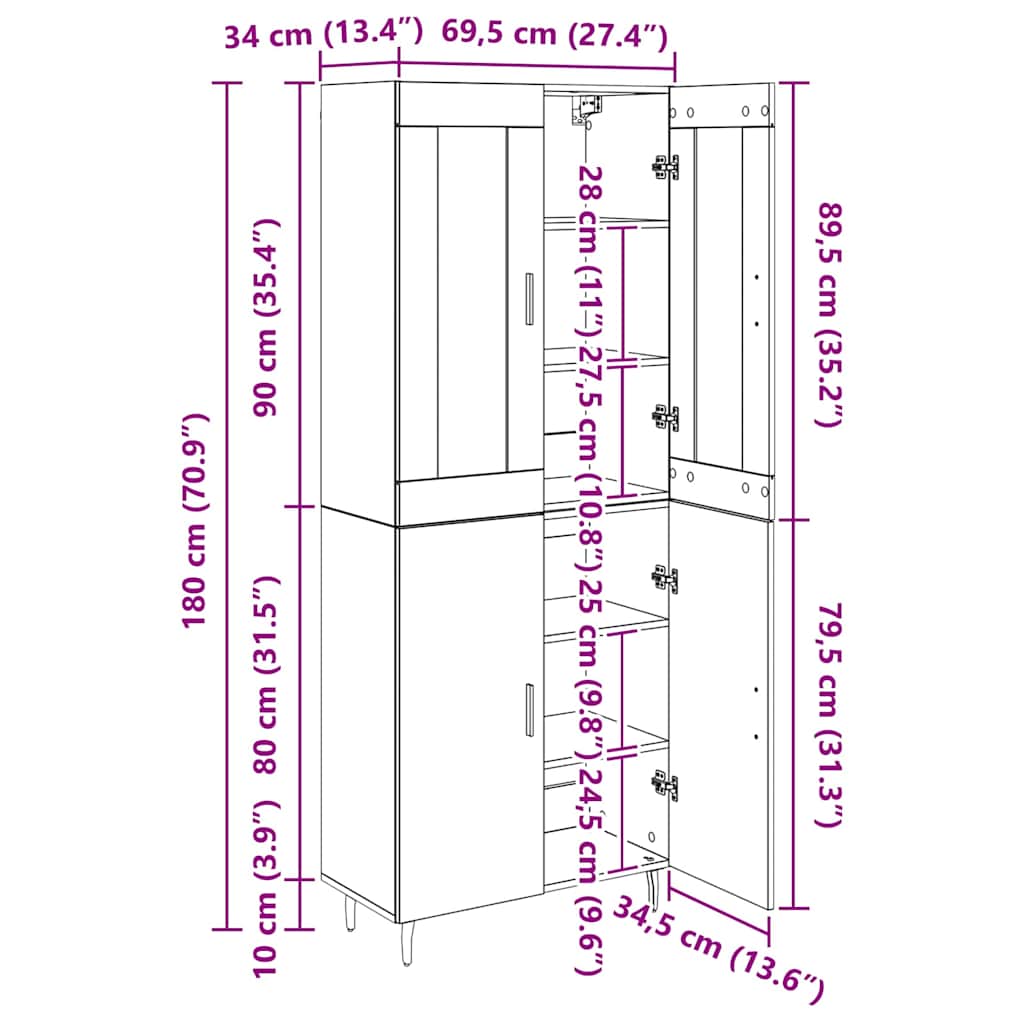 - 1 x Oben für Highboard: 69,5 x 34 x 90 cm (LxBxH)
