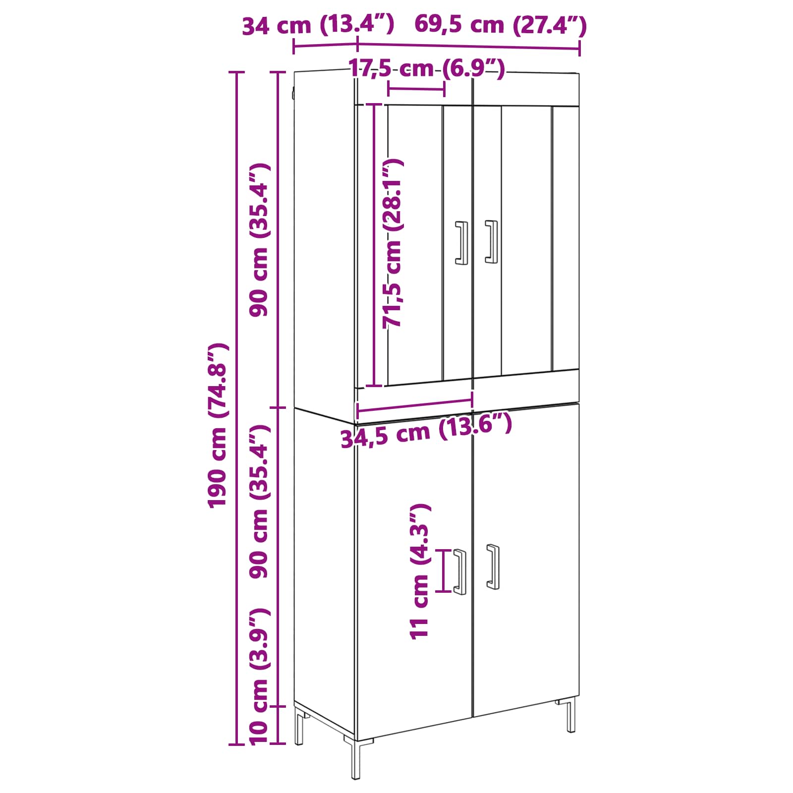 - Gesamtabmessungen: 69,5 x 34 x 180 cm (L x B x H)