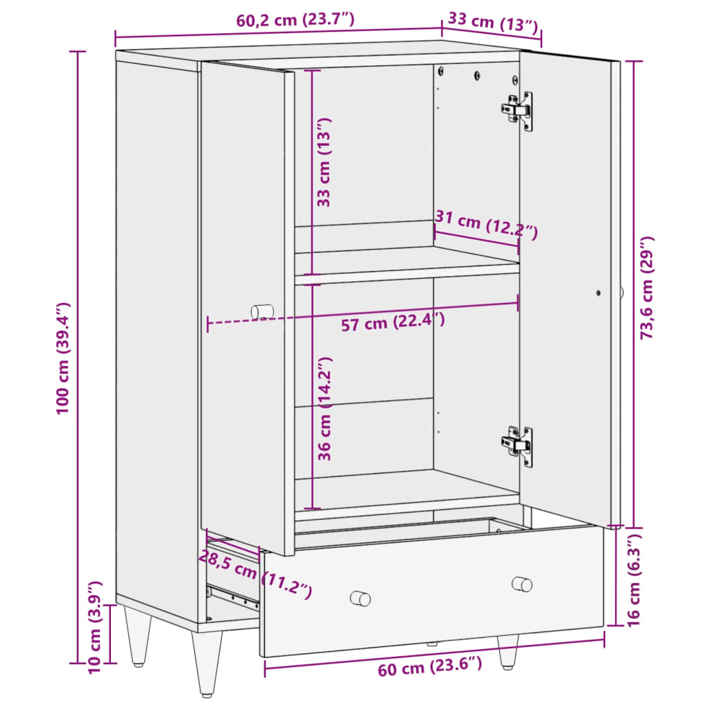 Dieses klassische Highboard soll eine dekorative und praktische Ergänzung für dein Zuhause sein. Massives Mangholz: Massives Mangoholz ist ein robustes, tropisches Hartholz, aus dem sich robuste Möbel herstellen lassen. Seine optisch ansprechende Holzmaserung macht jedes Möbelstück zu einem Unikat. Der Schrank ist aus massivem Mangoholz gefertigt und daher langlebig und stabil.Viel Stauraum: Das Sideboard bietet reichlich Stauraum, um die verschiedenen Dinge des täglichen Bedarfs gut organisiert und in Reichweite aufzubewahren.Praktische Tür: Sorge für Ordnung in deinem Wohnzimmer, indem du wichtige Kleinigkeiten in diesem Schrank hinter den Türen versteckst.Möbelbeine aus Holz: Die Holzbeine verleihen dem Möbelstück eine natürliche und angenehme Optik und sorgen gleichzeitig für Stabilität. Der Schrank fügt sich daher harmonisch in jede Inneneinrichtung ein.Handgeschnitztes Design: Mit einem handgeschnitzten Muster versehen, bringt der Beistellschrank Luxus und Eleganz in dein Interieur und wird überall ein echter Hingucker sein. Gut zu wissen:Jedes Stück ist ein Unikat, das in Farbe und Maserung variiert. Die Lieferung erfolgt in zufälliger Reihenfolge, wodurch die Exklusivität und Individualität deines Produkts gewährleistet wird. Achtung:Um ein Umkippen zu vermeiden, sollte dieses Produkt mit der mitgelieferten Wandhalterung gesichert werden.