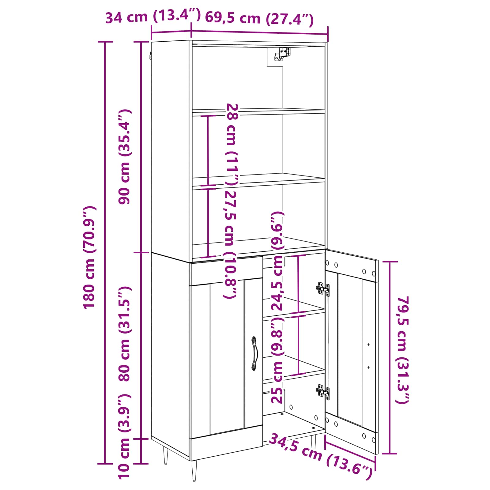 - Gesamtabmessungen: 69,5 x 34 x 180 cm (L x B x H)