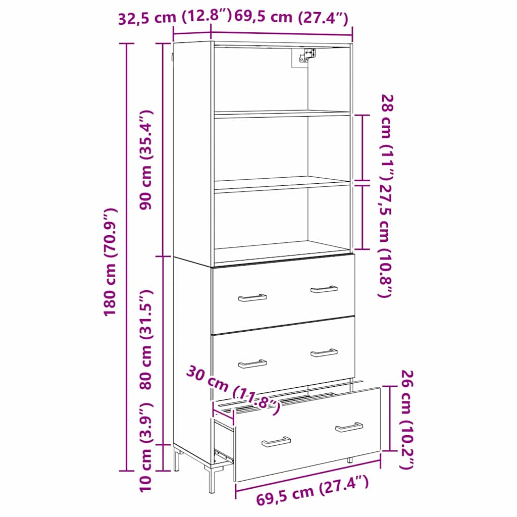 - Gesamtabmessungen: 69,5 x 32,5 x 180 cm (L x B x H)