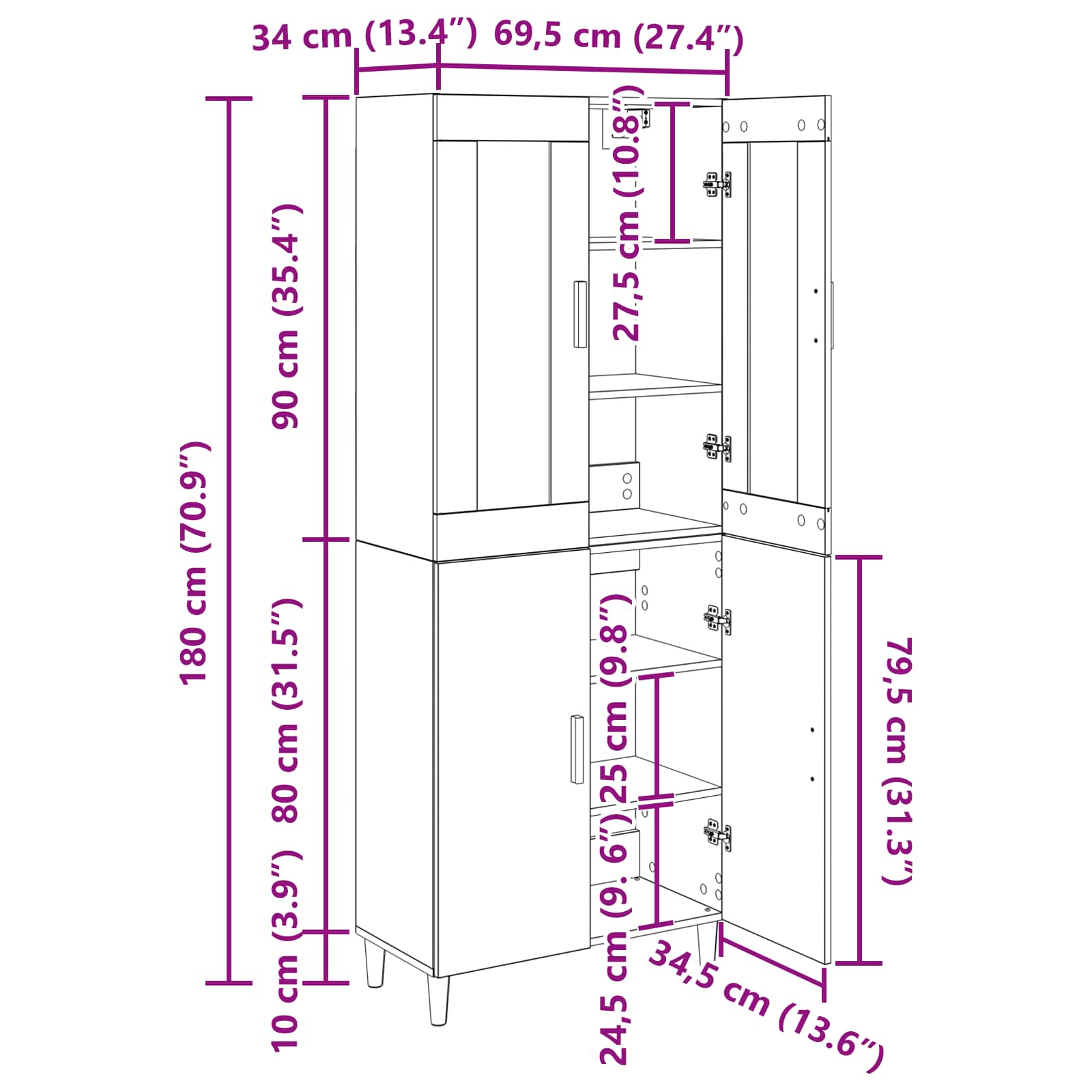 - Gesamtabmessungen: 69,5 x 34 x 180 cm (L x B x H)