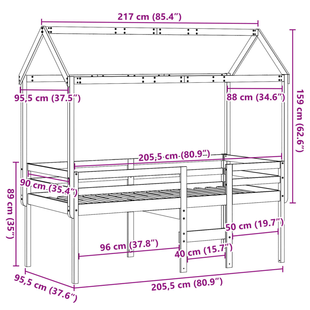 Dieses Hochbett, bei dem die Vielseitigkeit im Mittelpunkt steht, ist eine perfekte Kombination aus schlichtem, modernem Design und Zweckmäßigkeit. Es ist ideal für kleine Räume. Massives Kiefernholz: Massives Kiefernholz ist ein wunderschönes Naturmaterial. Kiefernholz weist eine gerade Maserung auf und die Aststellen verleihen dem Material seine charakteristische, rustikale Optik.Praktische Funktion: Das Hochbett eignet sich hervorragend, um den Platz im Kinderzimmer optimal auszunutzen. Du kannst es mit einem coolen Spielvorhang, einer Spielmatratze und einem Spielzelt kombinieren oder den Platz unter der Liegefläche als Stauraum nutzen. Die Latten aus Sperrholz bieten zusätzlichen Halt. Sie verlängern die Lebensdauer der Matratze, indem sie den größten Teil der Belastung und des Gewichts aufnehmen.Sicheres Design: Die in das Hochbett eingebaute Leiter erleichtert das Ein- und Aussteigen, und die Geländer sorgen dafür, dass deine Kleinen sicher schlummern können.Viel Spaß: Durch das Anbringen dieses Dachgestells am Kinderbett kannst du einen Rückzugsort schaffen, der deinem Kind viel Spaß vor dem Schlafengehen bietet. Diese innovative Ergänzung wird nicht nur ein spannender Blickfang sein, sondern auch für Staunen und Spannung im Kinderzimmer sorgen.Offene Seite: Das Dach verfügt über eine offene Seite, die den Kindern den Ein- und Ausstieg erleichtert, Gut zu wissen:Bei diesem Bett ist keine Matratze im Lieferumfang enthalten. Wir bieten jedoch eine große Auswahl an Matratzen an. Du kannst in unserem Shop nach einer passenden Matratze suchen.