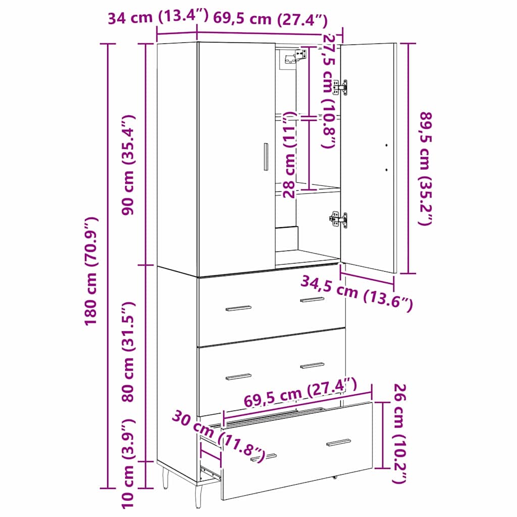 - Gesamtabmessungen: 69,5 x 34 x 180 cm (L x B x H)