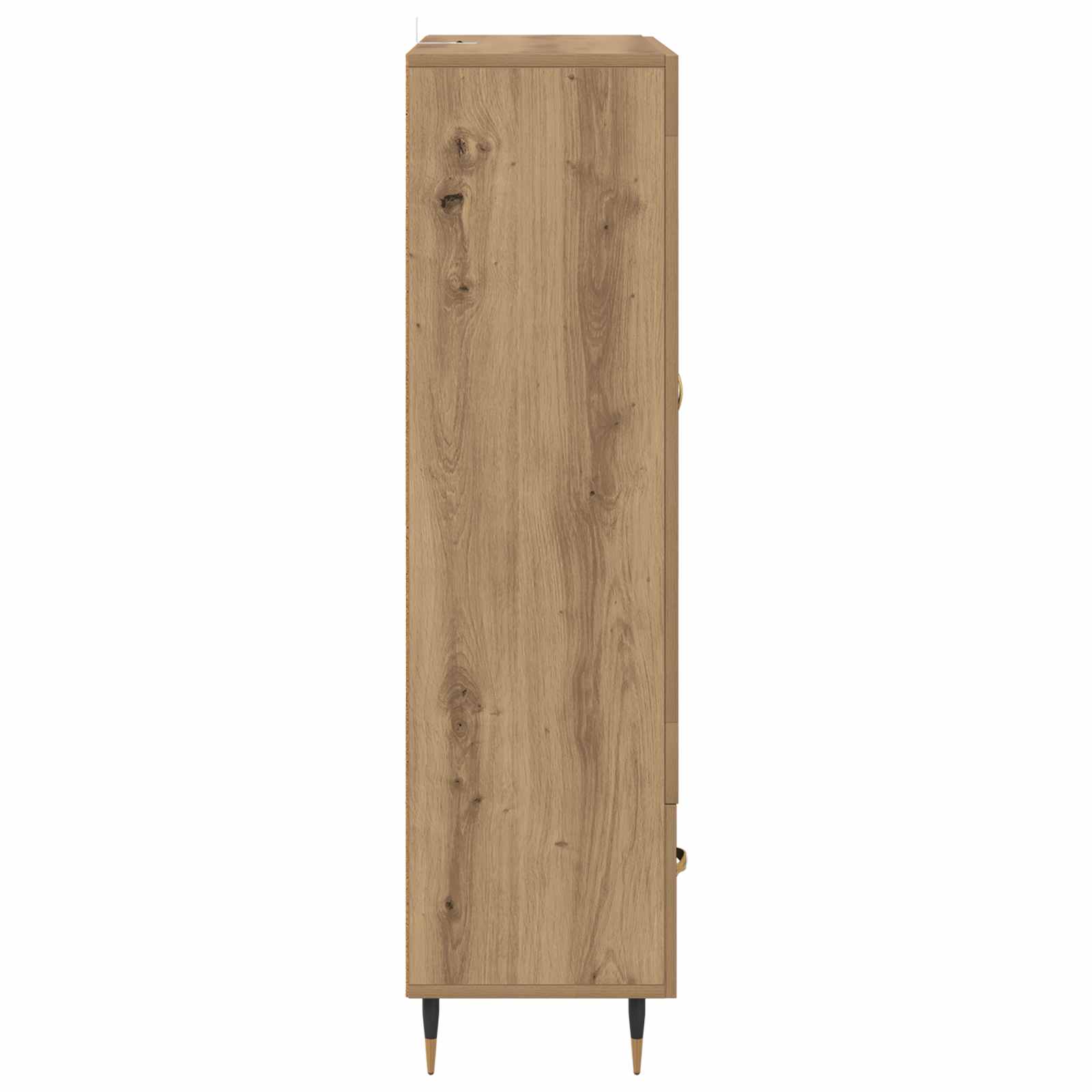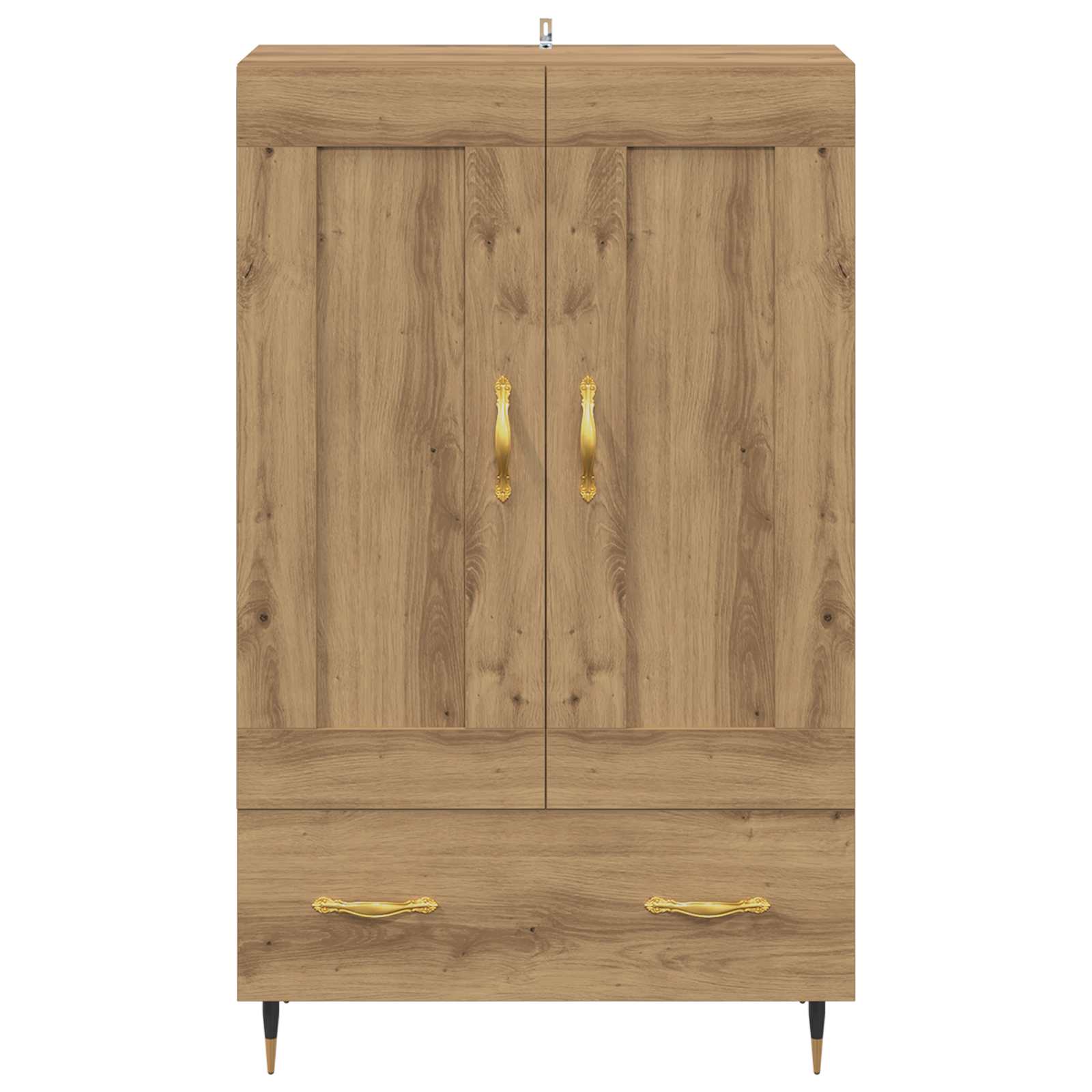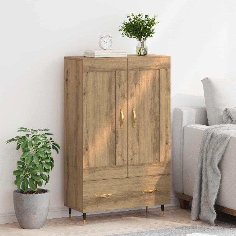 Dieses moderne Highboard ist der perfekte Hingucker für dein Wohnzimmer! Es kombiniert Praktikabilität mit einem zeitgemäßen Design. Mit seiner eleganten rechteckigen Form und klaren Linien bietet es viel Platz für all deine Sachen und hält gleichzeitig einen schlanken Look. Ideal zur Aufbewahrung von verschiedenen Gegenständen – dieses Stück wird jeden Raum aufpeppen und eine praktische Lösung zum Organisieren und Ausstellen bieten! Konstruktion aus Holzwerkstoff Das Highboard ist aus robustem Holzwerkstoff gefertigt, der täglichem Verschleiß standhält. Dieses Material wurde gewählt, damit das Möbelstück über Jahre hinweg gut aussieht. Die Oberfläche bleibt auch bei häufigem Gebrauch attraktiv. Metallgriffe und Beine Mit goldenen Stangengriffen und eleganten schwarzen Beinen bringt das Highboard modernen Charme und nützliche Funktionalität. Die Metallteile sorgen für Stabilität und einen einfachen Gebrauch, sodass du alles ganz bequem erreichst. Regale mit Fächern Die Brett-Regale helfen dir, alles organisiert aufzubewahren. Ob Bücher, Deko oder Geschirr – du hast immer schnellen Zugang zu deinen Dingen, und der Raum bleibt ordentlich und schick. Zugänglichkeit durch Tür mit Scharnieren Das Highboard hat eine praktische Tür mit Scharnieren, die für einen einfachen Zugang und eine langlebige Haltbarkeit sorgt. So kannst du alles schnell erreichen, und das Design bleibt durch diese Funktion modern und ansprechend. Pflegehinweise Halte das Highboard mit einem trockenen Tuch in Top-Zustand. Sichere es mit dem mitgelieferten Befestigungsmaterial an der Wand, um ein Umkippen zu verhindern, und sorge so für mehr Sicherheit.
