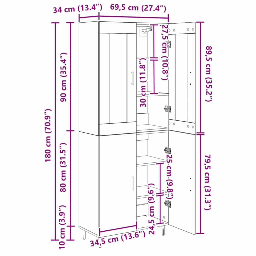 Hochboard Schwarz Eichen-Optik 69,5 x 34 x 180 cm Holzwerkstoff
