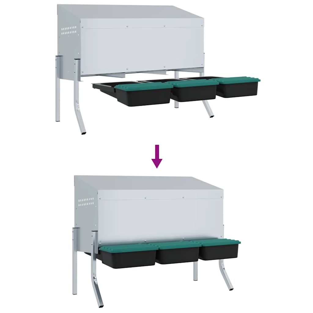 Verbessern Sie Ihre Geflügelhaltung mit dem Hühnernistkasten und bieten Sie Ihren Hühnern einen privaten, komfortablen Legebereich. Robustes und langlebiges Material: Dieser aus verzinktem Stahl und robustem Polypropylen-Kunststoff gefertigte Nistkasten ist auf Langlebigkeit ausgelegt und bietet Ihren Hühnern lang anhaltende Leistung und Schutz vor rauen Außenbedingungen.Bequemes Eiersammeln: Der leicht anzuhebende Deckel und das ausrollbare Design ermöglichen ein müheloses Eiersammeln, ohne dass die Hühner gestört werden. Das durchdachte Design schafft eine ruhige Umgebung für Ihre Hühner und macht das Eiersammeln reibungslos, problemlos und pflegeleicht.Individuelle Höhe: Der Nistkasten ist einfach zu installieren, da er mit dem notwendigen Zubehör geliefert wird. Dank zusätzlicher Bohrlöcher können Sie die Beine auf zwei verschiedene Höhen einstellen. Befolgen Sie einfach die beiliegenden Anweisungen für einen einfachen Aufbau.Durchdachte Belüftung: Der Nistkasten ist mit Lüftungsschlitzen und einer offenen Vorderseite ausgestattet, um eine optimale Luftzirkulation zu gewährleisten und so eine trockene, geruchsfreie und komfortable Umgebung für Ihre Hühner zu schaffen und gleichzeitig Feuchtigkeits- und Geruchsbildung zu verhindern.Mühelose Reinigung: Die Ablage lässt sich zur schnellen Reinigung leicht herausnehmen, während die glatten Oberflächen sowohl der Ablage als auch des Kastens ein problemloses Erlebnis gewährleisten und dazu beitragen, eine sauberere und hygienischere Umgebung für Ihre Hühner zu schaffen. Gut zu wissen:Um Kratzer zu vermeiden, wird empfohlen, während der Installation Handschuhe zu tragen.