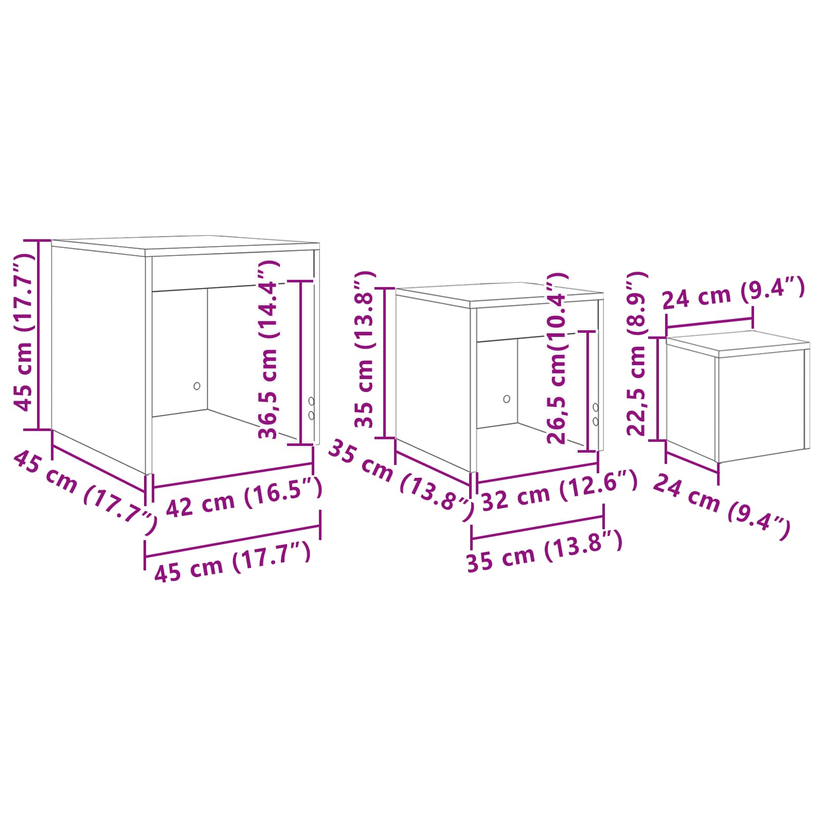 Dieses Set aus schwarzen Nesting-Tischen aus massiver Eiche ist die perfekte Wahl für alle, die vielseitige und stylische Möbel wollen. Sie sind genau das, was du für moderne Wohnbereiche brauchst, da sie sich nahtlos in zeitgemäße und traditionelle Stile einfügen. Ideal fürs Wohnzimmer oder das Home-Office, können diese Tische als Akzent- oder Beistelltische genutzt werden, die super zu deinen vorhandenen Möbeln passen. Platzsparendes Design: Mit der Nesting-Funktion verschwinden die kleineren Tische einfach unter dem größeren und sparen so wertvollen Platz, wenn du sie nicht brauchst. Dieses clevere Design gibt dir extra Raum für Getränke, Snacks oder Deko, wenn du ihn brauchst und macht alles ordentlich. Materialqualität: Diese Nesting-Tische sind aus robustem Massivholz gemacht und für die Ewigkeit gebaut. Eiche ist richtig stark, also können sie den täglichen Gebrauch ab und sehen dabei stets gut aus. Vielseitige Nutzung: Diese Tische sind super vielseitig und passen in jeden Raum. Nutze sie als Akzenttische neben dem Sofa, Beistelltische oder einfach als stilvollen Platz, um Pflanzen oder Deko zu präsentieren und das Ambiente deines Raumes zu heben. Zeitgenössischer Stil: Mit ihrer coolen schwarzen Oberfläche liegen diese Nesting-Tische voll im Trend. Die matte Oberfläche und die klaren Linien schaffen eine warme und einladende Atmosphäre, die sie zu einem Highlight in deinem Interior-Design machen. Einfacher Aufbau: Jeder Tisch kommt mit einer einfachen Aufbauanleitung, so bist du im Handumdrehen startklar. Schnapp dir einfach einen Freund und einen Schraubendreher und bevor du es merkst, sind deine schönen Tische bereit zum Einsatz.