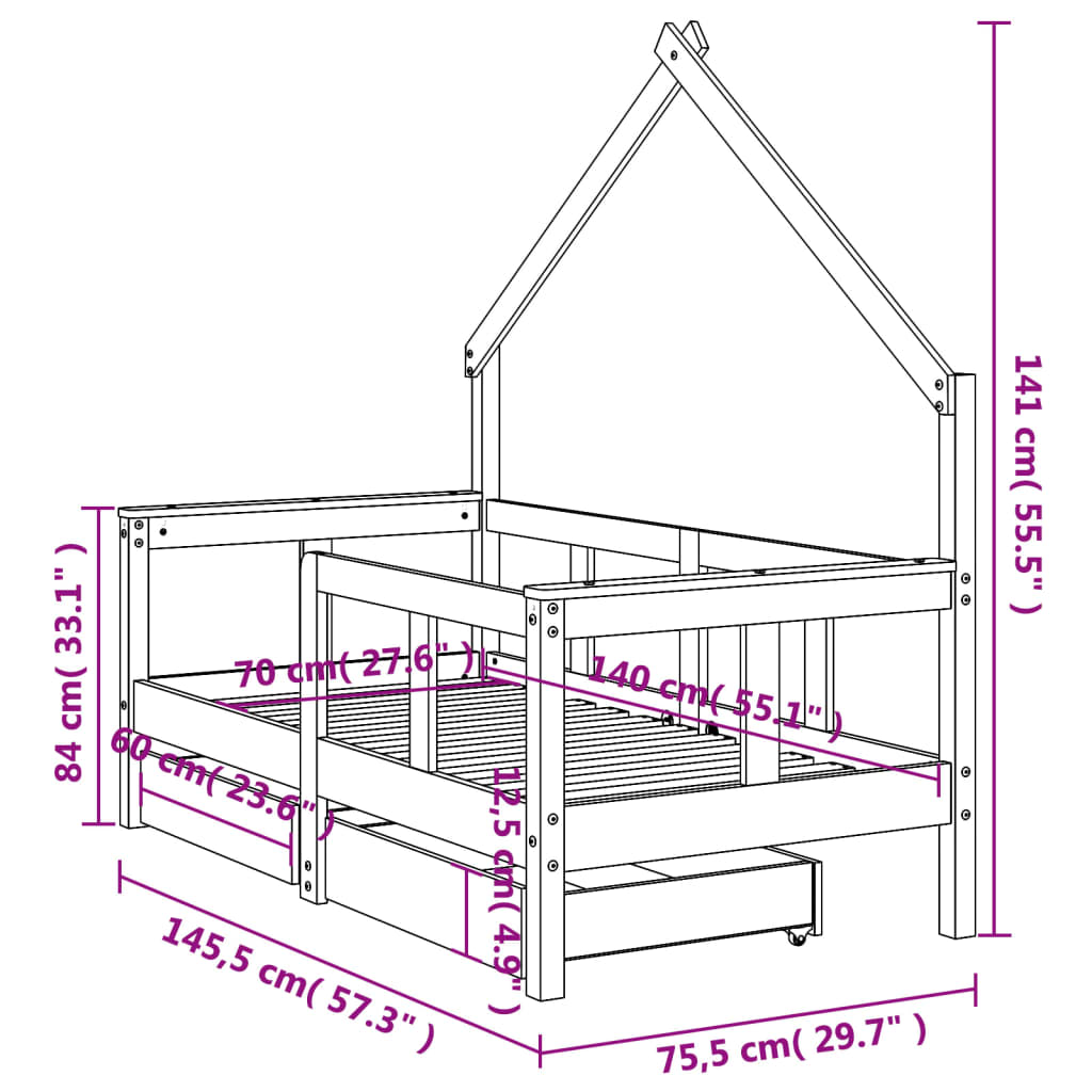 Mit diesem fantastischen Kinderbett aus Holz bietest du deinen Kleinen einen eigenen lustigen Platz! Massives Kiefernholz: Das Kinderbett ist aus massivem Kiefernholz gefertigt. Massives Kiefernholz ist ein wunderschönes Naturmaterial. Kiefernholz weist eine gerade Maserung auf und die Aststellen verleihen dem Material seine charakteristische, rustikale Optik.Robuste Latten: Das Kinderbett ist mit Holzlatten versehen, die für einen festen Halt, Belüftung und Stabilität sorgen.Design in Hausform: Mit seinem coolen und doch schlichten Design macht dieses Kleinkinderbett das Schlafengehen zu einem lustigen Erlebnis. Es bietet viele Möglichkeiten zum Spielen und Aufbauen einer kleinen Kinderwelt, um Kreativität und Fantasie anzuregen.Mit Schubladen: Die mitgelieferten Schubladen bieten reichlich Platz für die Aufbewahrung von Kleinspielzeug, Kleidung und Bettzeug, um für Ordnung im Kinderzimmer zu sorgen.Durchdachtes Design: Dank der geringen Höhe des Einzelbettes können Kinder leicht ins Bett ein- und aussteigen.