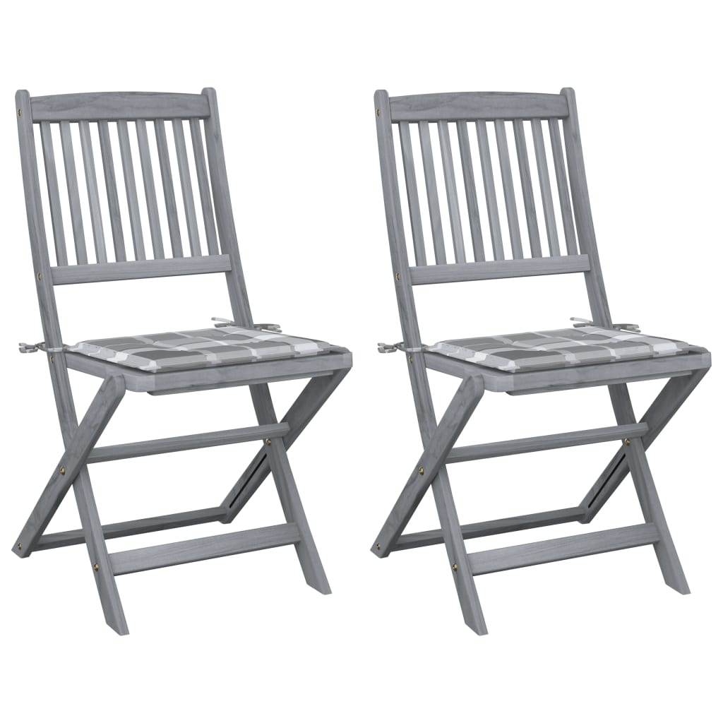 Dieses moderne Set aus Holz-Gartenstühlen mit Sitzpolstern verleiht Ihrem Garten, Ihrer Terrasse oder Ihrem Hof einen Hauch von natürlichem Stil und ist außerdem eine ausgezeichnete Wahl für Mahlzeiten im Freien. Diese Essstühle bestehen aus massivem Akazienholz, einem tropischen Hartholz, was die Stühle witterungsbeständig macht und eine jahrelange Lebensdauer gewährleistet, da massives Akazienholz sowohl belastbar als auch verschleißfest ist. Die grau lasierte Oberfläche ist ganz einfach mit einem feuchten Tuch zu reinigen. Bei Nichtgebrauch lassen sich die Stühle platzsparend zusammenklappen. Darüber hinaus bieten die mitgelieferten Sitzkissen zusätzlichen Komfort beim Entspannen oder Speisen. Zur sicheren Befestigung am Stuhl ist jedes Sitzpolster mit je zwei Bindebändern an zwei Ecken versehen.