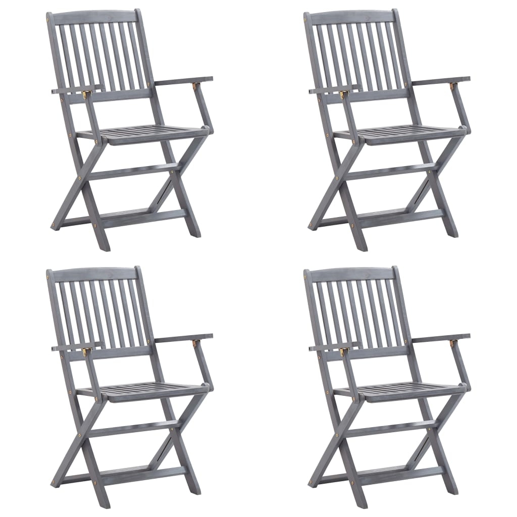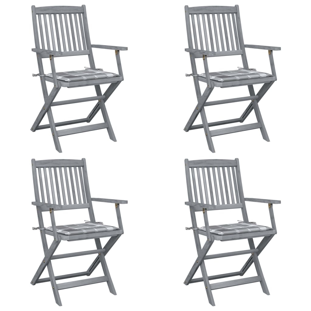Dieses moderne Set aus Holz-Gartenstühlen mit Sitzpolstern verleiht Ihrem Garten, Ihrer Terrasse oder Ihrem Hof einen Hauch von natürlichem Stil und ist außerdem eine ausgezeichnete Wahl für Mahlzeiten im Freien. Diese Essstühle bestehen aus massivem Akazienholz, einem tropischen Hartholz, was die Stühle witterungsbeständig macht und eine jahrelange Lebensdauer gewährleistet, da massives Akazienholz sowohl belastbar als auch verschleißfest ist. Die grau lasierte Oberfläche ist ganz einfach mit einem feuchten Tuch zu reinigen. Bei Nichtgebrauch lassen sich die Stühle platzsparend zusammenklappen. Darüber hinaus bieten die mitgelieferten Sitzkissen zusätzlichen Komfort beim Entspannen oder Speisen. Zur sicheren Befestigung am Stuhl ist jedes Sitzpolster mit je zwei Bindebändern an zwei Ecken versehen.