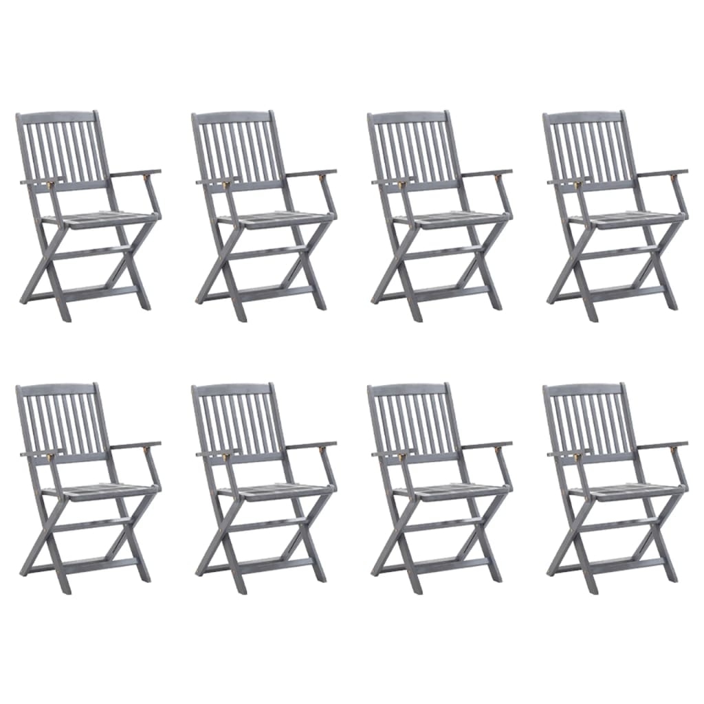 Dieses moderne Set aus Holz-Gartenstühlen mit Sitzpolstern verleiht Ihrem Garten, Ihrer Terrasse oder Ihrem Hof einen Hauch von natürlichem Stil und ist außerdem eine ausgezeichnete Wahl für Mahlzeiten im Freien. Diese Essstühle bestehen aus massivem Akazienholz, einem tropischen Hartholz, was die Stühle witterungsbeständig macht und eine jahrelange Lebensdauer gewährleistet, da massives Akazienholz sowohl belastbar als auch verschleißfest ist. Die grau lasierte Oberfläche ist ganz einfach mit einem feuchten Tuch zu reinigen. Bei Nichtgebrauch lassen sich die Stühle platzsparend zusammenklappen. Darüber hinaus bieten die mitgelieferten Sitzkissen zusätzlichen Komfort beim Entspannen oder Speisen. Zur sicheren Befestigung am Stuhl ist jedes Sitzpolster mit je zwei Bindebändern an zwei Ecken versehen. Hinweis: Um die Lebensdauer Ihrer Gartenmöbel zu verlängern, empfehlen wir Ihnen, diese regelmäßig zu reinigen und im Freien vor Niederschlägen oder starken Sonnenstrahlen zu schützen.Reinigung: Verwenden Sie eine milde SeifenlösungLagerung: Wenn möglich, an einem kühlen, trockenen Ort im Innenbereich lagern. Wenn das Produkt im Freien gelagert wird, schützen Sie es mit einer wasserdichten Abdeckung. Wischen und trocknen Sie das überschüssige Wasser oder den Schnee nach Regen oder Schneefall von ebenen Flächen. Sorgen Sie für eine ausreichende Luftzirkulation, um feuchtigkeitsbedingte Schäden zu vermeiden.