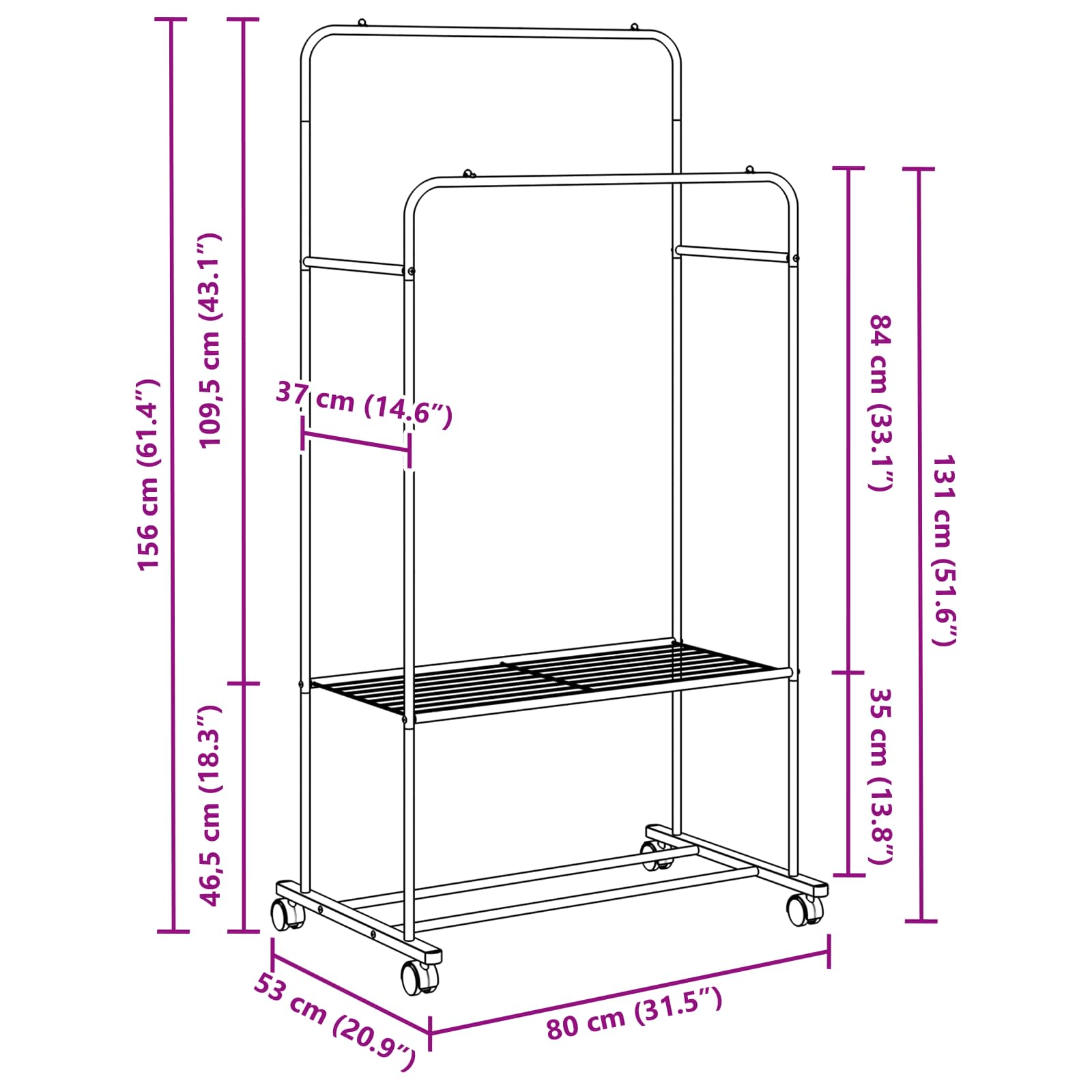 Dieser moderne Kleiderständer ist eine coole, stilvolle Lösung, um deine Garderobe im Schlafzimmer oder wo auch immer zu organisieren. Mit seinem minimalistischen Design und dem großen Stauraum fügt er sich super in moderne Interieurs ein und sorgt für eine mega praktische Nutzung. Die stabile Struktur sieht nicht nur gut aus, sondern macht ihn auch zur idealen Wahl für alle, die auf Einfachheit und Funktionalität setzen. Glattes Metallfinish : Der Kleiderständer hat ein mattes Metallfinish, das nicht blendet und dafür sorgt, dass deine Kleidung immer gut aussieht. Praktische Drahtregale : Die Drahtregale sind klasse, um Schuhe und Accessoires stabil zu lagern und bieten viel Platz für deine Sachen. Einfacher und funktionaler Stil : Dank dem modernen Design mit klaren Linien wirkt er nicht nur stylisch, sondern passt auch prima in jedes Zimmer. Bequem zu benutzen : Er lässt sich leicht umstellen, ideal wenn du mal was verändern willst. Einfache Pflege : Ein feuchtes Tuch reicht aus, um ihn sauber zu halten – so bleibt er immer in Top-Zustand.