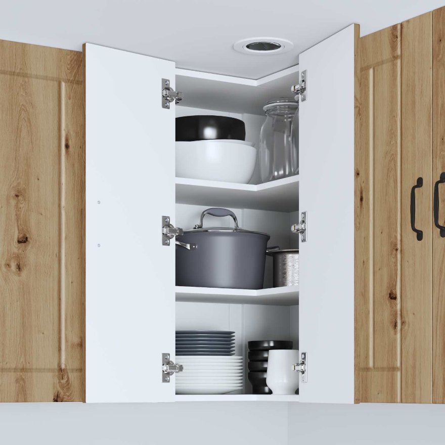 Der Holz-Küchenwandschrank verbindet modernes Design mit praktischen Funktionen und bringt frischen Wind in deine Küche. Er sorgt für mehr Ordnung und sieht dabei auch noch richtig gut aus, mit klaren Linien und ganz ohne Schnickschnack. Perfekt zum Organisieren und Aufbewahren aller möglichen Küchenutensilien. Material: Hergestellt aus hochwertigem Holzwerkstoff, ist dieser Schrank eine schicke und robuste Lösung für deine Küche. Dank der Langlebigkeit des Materials kannst du ihn lange nutzen, und er erfordert wenig Pflege. Ideal für alle, die Wert auf Aussehen und Haltbarkeit legen. Regal-Design: Mit praktischen Brettern, die dir helfen, Geschirr, Gewürze und anderes gut zu sortieren. Dank der klaren Struktur vermeidest du Unordnung und hast alles sofort griffbereit. Tür mit Scharnieren: Die eleganten Türen passen zum modernen Look des Schranks und sind zusätzlich praktisch. Sie öffnen sich leicht und die schwarzen Stangengriffe setzen einen tollen Akzent. Wandhalterung: Der wandmontierte Design nutzt den vertikalen Raum optimal und hält deine Arbeitsflächen frei. So bleibt die Küche ordentlich und aufgeräumt. Pflegehinweise: Die Pflege ist kinderleicht; einfach mal mit einem feuchten Tuch drüber wischen, um Staub und Schmutz zu entfernen. Keine scharfen Chemikalien nötig, also geht das schnell und unkompliziert. Regelmäßige Pflege sorgt dafür, dass er immer gut aussieht.