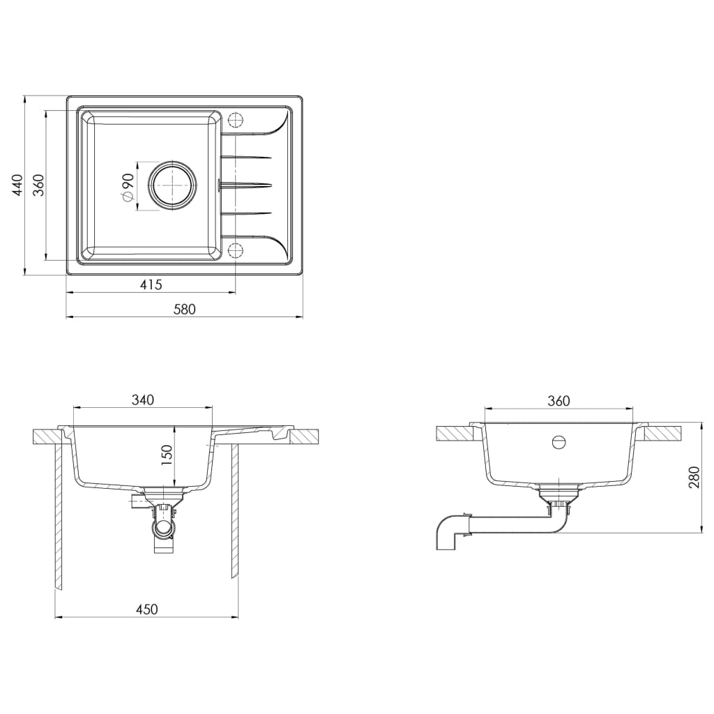 - Beckenmaße: 340 x 360 x 150 mm (B x T x H)
