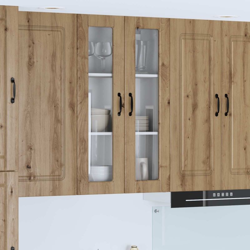 Dieser Holz-Küchenwand-Schrank kombiniert stylishes Design mit praktischer Funktion und ist eine super Ergänzung für jede Küche. Der Schrank aus Holzwerkstoff hat eine moderne Optik mit klaren Linien und ist perfekt für alle, die einfache Eleganz lieben. Sein schlankes Aussehen sorgt dafür, dass alles ordentlich und einladend aussieht. Er passt zu verschiedenen Küchenstilen und bringt sowohl Nutzen als auch Charme mit. Egal, ob du Küchengeräte oder Deko unterbringst, das coole Design macht deinen Kochbereich übersichtlich und attraktiv für den alltäglichen Gebrauch. Materialien: Der Küchenschrank besteht aus hochwertigem Holzwerkstoff, der stark und schön ist. Das Holz wurde behandelt, um Feuchtigkeit standzuhalten, was es perfekt für die Küche macht, wo immer mal was verschüttet. Die Oberfläche hält den täglichen Anforderungen stand und sieht dabei schick aus. Durch die präzise Verarbeitung hat der Schrank einen stabilen Rahmen, der sicherstellt, dass du deine Sachen ordentlich aufbewahren kannst. Inklusive Komponenten: Der Schrank hat robuste Regale, die genug Platz für Geschirr und Vorräte bieten. Jedes Regal ist aus hochwertigem Holzwerkstoff, was für Qualität und gutes Aussehen sorgt. Die nicht sichtbaren Rückwände sorgen für Stabilität und behalten das moderne, klare Design bei. So passt alles gut zusammen, ohne dass das Auge gestört wird. Merkmale / Funktion / Design: Mit dem Fokus auf Stil und Zweckmäßigkeit fügt sich das minimalistische Design in verschiedene Küchen ein. Er eignet sich nicht nur für moderne, sondern auch für traditionelle Küchen und bietet eine flexible Lösung für die Aufbewahrung. So bleibt alles gut organisiert und für den täglichen Gebrauch griffbereit. Empfohlene Verwendung: Dieser Wandschrank ist ideal für den Gebrauch in Innenräumen, besonders in der Küche. Er kann für alles Mögliche genutzt werden, vom Platz für Kochbücher bis zur Aufbewahrung von Lebensmitteln. Seine zentrale Lage in der Küche sorgt dafür, dass alles leicht erreichbar ist. Das schicke Design sorgt dafür, dass er sich harmonisch in jede Küche einfügt und den funktionalen Bereich verbessert. Pflege und Wartung: Um den modernen Look zu erhalten, wisch die Oberfläche des Schranks mit einem feuchten Tuch ab. Vermeide aggressive Chemikalien, damit die Oberfläche schön bleibt. Regelmäßiges Putzen verlängert die Lebensdauer des Schranks und sorgt dafür, dass deine Investition in dieses wichtige Küchenmöbel sich länger auszahlt.
