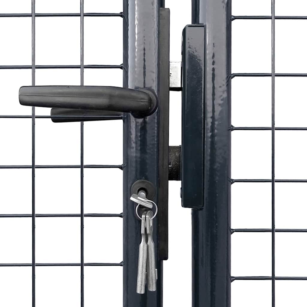Dank seiner hohen Stabilität und Langlebigkeit kann dieses Gartentor als praktischer, moderner Eingang zu Ihrem Garten, Hof oder Terrasse eingesetzt werden. Dieses Gartentor weist eine makellose Verarbeitung auf und ist aus verzinktem Stahl mit pulverbeschichteter Oberfläche gefertigt, der rostbeständig ist und eine stabile Konstruktion bildet. Das Tor verfügt zudem über zwei Seitenpfosten mit Scharnieren, die eine einfache Montage ermöglichen und wird samt Erdspieß für den großen, unteren Riegel geliefert, der dafür sorgt, dass das Tor sicher verschlossen werden kann. Die Lieferung umfasst auch drei Schlüssel.