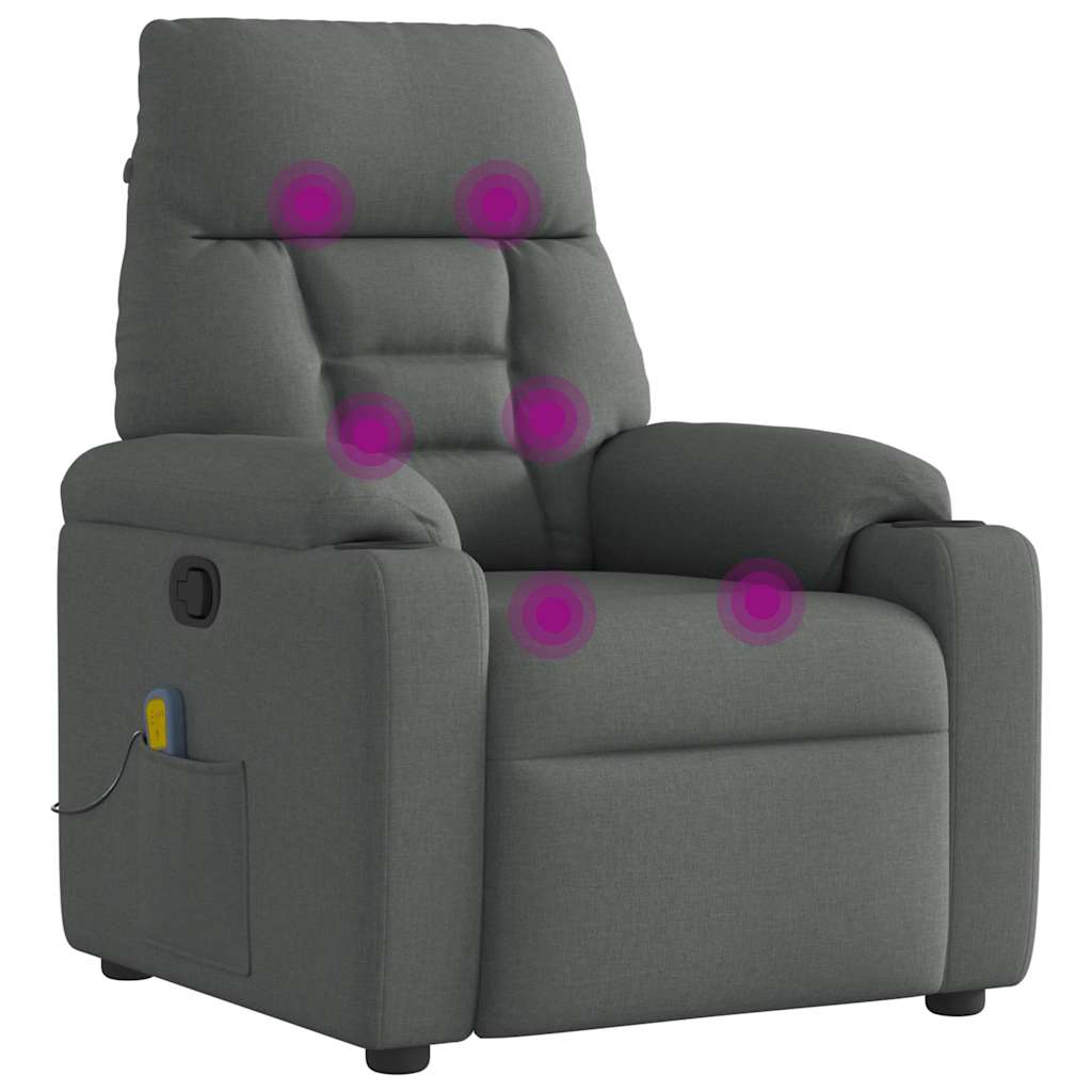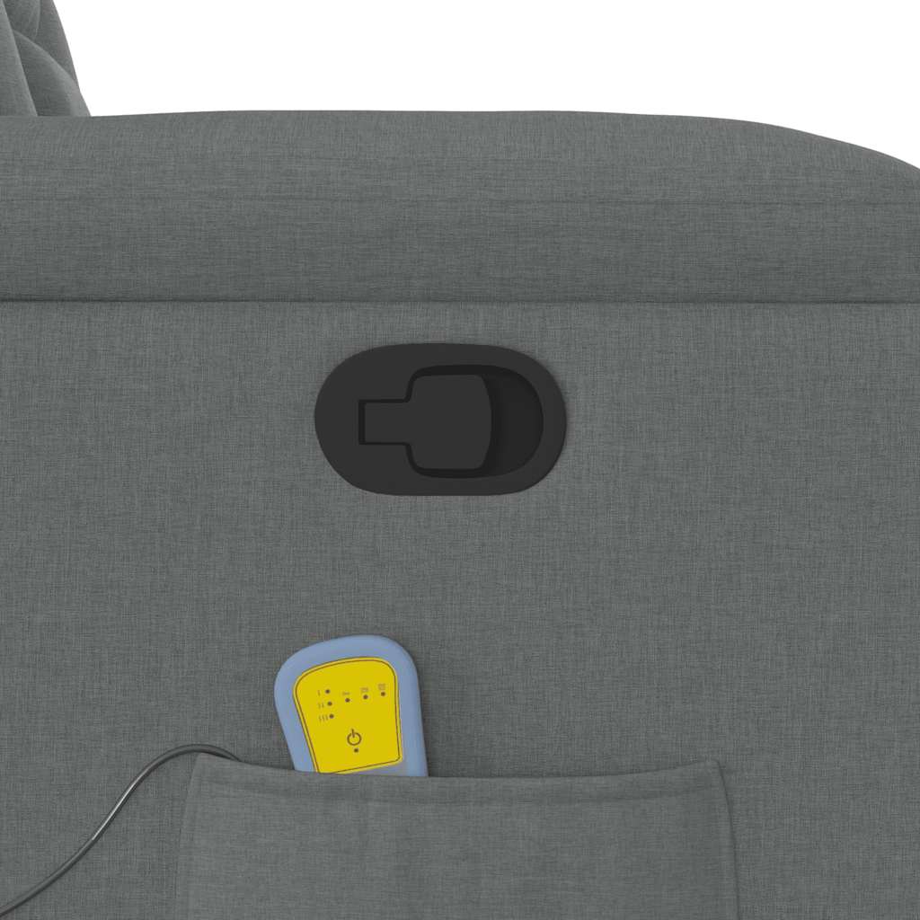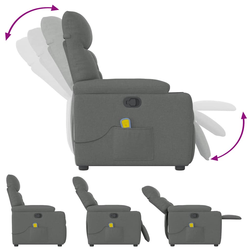 Lehne dich zurück und entspanne dich in diesem äußerst bequemen Massagesessel! Manuelle Liegefunktion: Dieser Ruhesessel lässt sich mittels des Griffs an der rechten Seite verstellen. So kannst du das Fußteil und die Rückenlehne manuell in jede beliebige Position bringen, um höchsten Komfort zu genießen. Die Rückenlehne lässt sich max. 135 Grad nach hinten verstellen. Durch einfaches Ziehen lässt sie sich schnell wieder in die ursprüngliche Position bringen.Vibrationsfunktion: Mit den 6 Massagepunkten kann man eine gezielte Massage genießen. Außerdem ermöglicht die mitgelieferte Handsteuerung die Auswahl verschiedener Massageprogramme. Die Massagefunktion wird über den USB-Anschluss mit Strom betrieben, aber das zugelassene 5V-USB-Netzteil ist nicht im Lieferumfang enthalten.Bequemes Sitzerlebnis: Die dick gepolsterte Sitzfläche, die Rückenlehne und die breiten Armlehnen sorgen für ein behagliches und wohliges Sitzgefühl. Der Bezug aus Stoff weist eine schlichte und saubere Optik auf und ist auch atmungsaktiv und langlebig.Praktische Getränkehalter und Seitentasche: Dieser Sessel verfügt über zwei praktische Getränkehalter und eine Seitentasche, in der du deine Fernbedienung oder andere wichtige Sachen griffbereit aufbewahren kannst.Solider und stabiler Rahmen: Der Rahmen aus Holz und Metall sorgt für eine solide Struktur und hohe Stabilität. Dieser TV-Sessel ist bequem und langlebig.