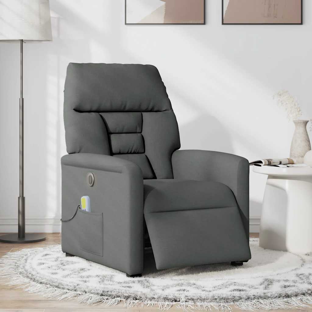 Lehne dich zurück und entspanne dich in diesem äußerst bequemen Massagesessel! Elektrische Liegefunktion: Dieser Relaxsessel ist mit einem Elektromotor ausgestattet, der Fußstütze und Rückenlehne durch einfaches Drücken des seitlichen Knopfes automatisch in jede gewünschte Position bringt. Diese Funktion ermöglicht eine maximale Neigung von 135 Grad. Darüber hinaus lässt sich die Rückenlehne auf Knopfdruck automatisch in die ursprünglichen Position zurückbringen.Vibrationsfunktion: Dank der 6 Massagepunkte genießt du eine gezielte Massage. Zudem lassen sich verschiedene Massageprogramme über die mitgelieferte Handsteuerung auswählen. Die Massagefunktion wird über den USB-Anschluss betrieben, der eine zertifizierte 5-V-USB-Stromquelle erfordert (nicht im Lieferumfang enthalten).Bequemes Sitzerlebnis: Die dick gepolsterte Sitzfläche, die Rückenlehne und die breiten Armlehnen sorgen für ein behagliches und wohliges Sitzgefühl. Der Bezug aus Stoff weist eine schlichte und saubere Optik auf und ist auch atmungsaktiv und langlebig.Praktische Getränkehalter und Seitentasche: Dieser Sessel verfügt über zwei praktische Getränkehalter und eine Seitentasche, in der du deine Fernbedienung oder andere wichtige Sachen griffbereit aufbewahren kannst.Solider und stabiler Rahmen: Der Rahmen aus Holz und Metall sorgt für eine solide Struktur und hohe Stabilität. Dieser TV-Sessel ist bequem und langlebig.