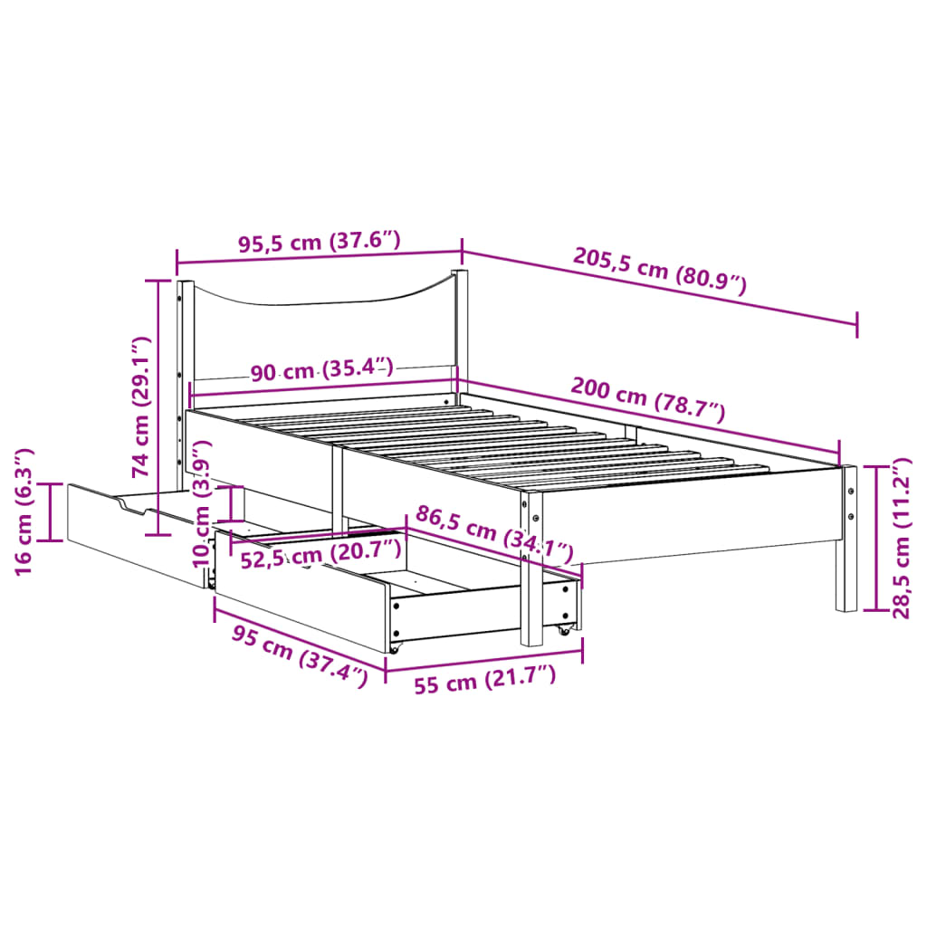 - Abmessungen: 205,5 x 95,5 x 74 cm (L x B x H)