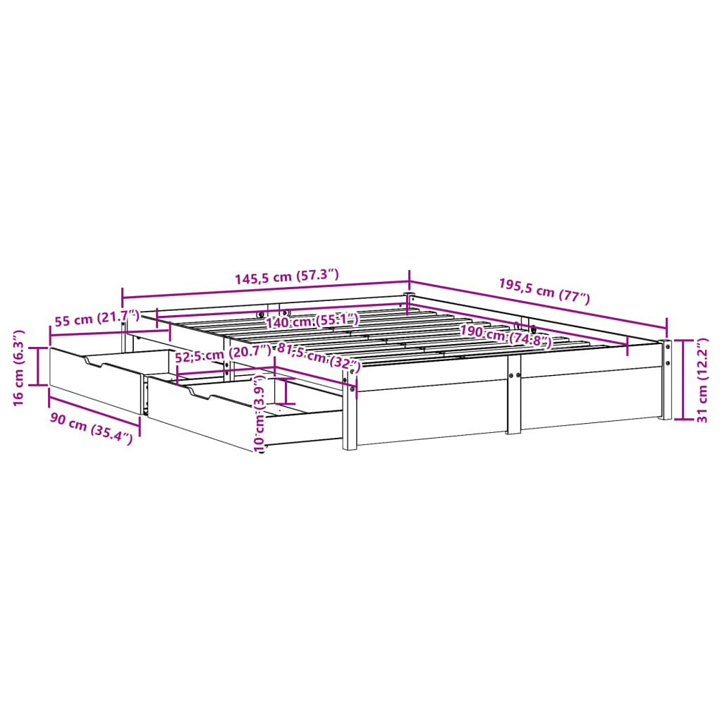 Mit diesem Bett wirst du einen besseren, erholsameren Schlaf genießen! Er ist eine einladende Ergänzung für jedes Schlafzimmer. Stabiles und langlebiges Gestell: Massives Kiefernholz ist für seine Stärke und Haltbarkeit bekannt. Seine gerade Maserung und die charakteristischen Aststellen tragen zu seinem rustikalen Charme bei.Lattenrost für optimale Unterstützung: Der Bettrahmen ist mit einem Lattenrost ausgestattet, der deine Matratze stützt und atmungsaktiv hält.Optimale Ausnutzung des Raumes: Dieser Bettrahmen verfügt über zwei Schubladen, in denen du Sachen wie zusätzliches Bettzeug, saisonale Kleidung und Spielzeug aufbewahren kannst.Leichtgängig: Dank der vier Rollen lässt sich die Unterbettschublade mühelos hineinschieben und herausziehen. Gut zu wissen:Bei diesem Bett ist keine Matratze im Lieferumfang enthalten. Wir bieten jedoch eine große Auswahl an Matratzen an. Du kannst in unserem Shop nach einer passenden Matratze suchen.