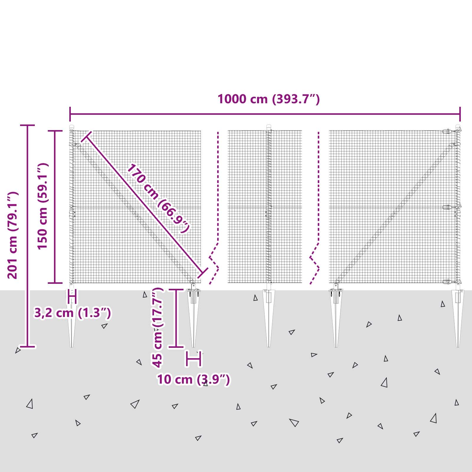 - Lieferumfang: Zaun-Mesh, Pfosten, Draht, Spike-Anker