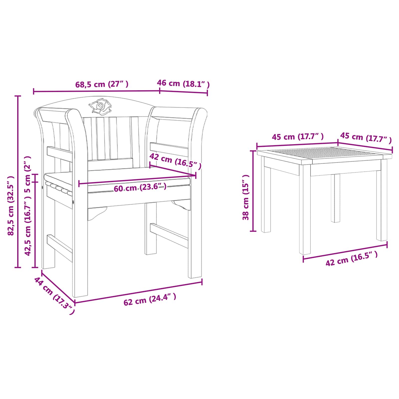 - 1 x Rose Stuhl: 68.5 x 46 x 82.5 cm (L x B x H)