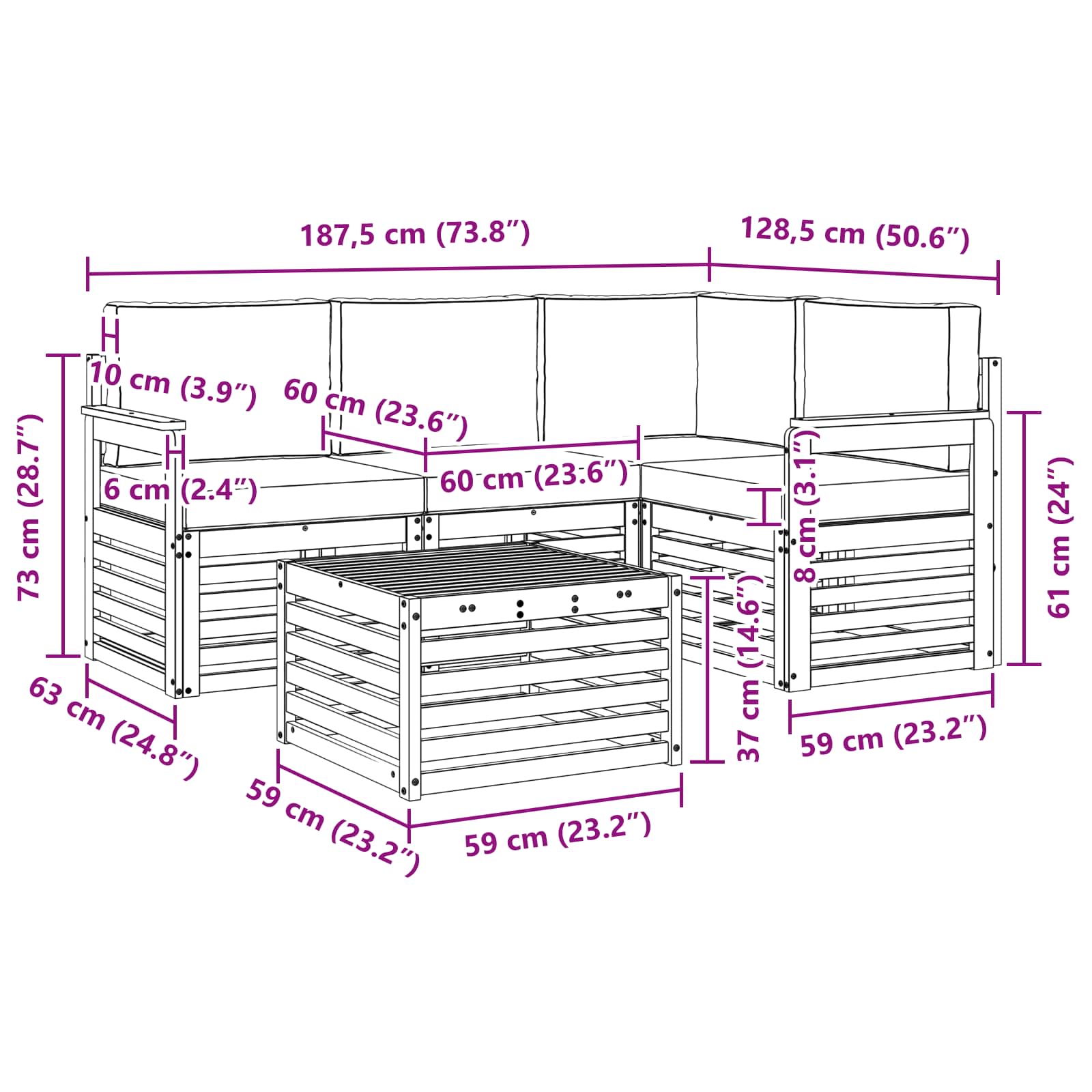 - 4 x Sitzkissen: 60 x 60 x 8 cm (LxBxH)