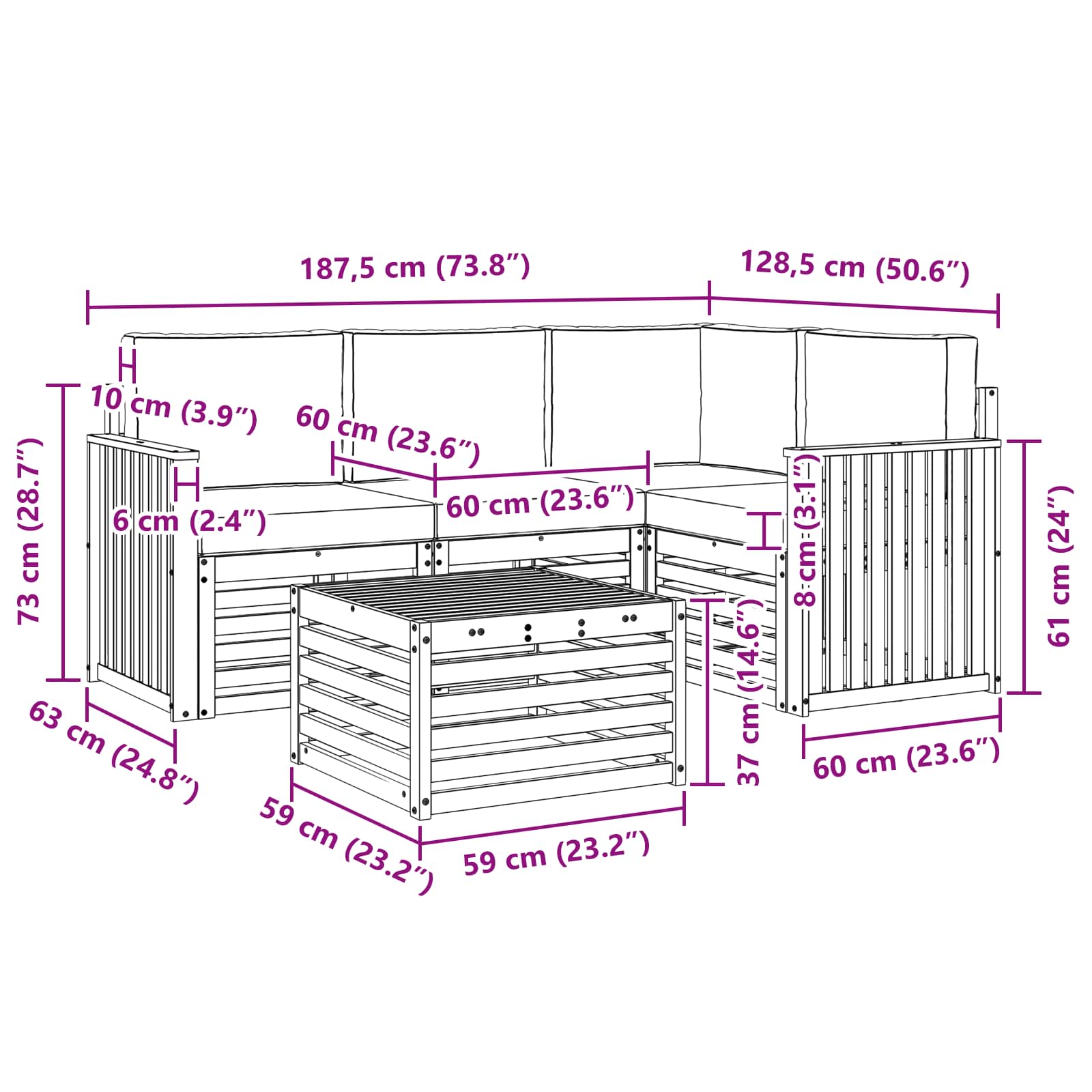 - 4 x Sitzkissen: 60 x 60 x 8 cm (LxBxH)