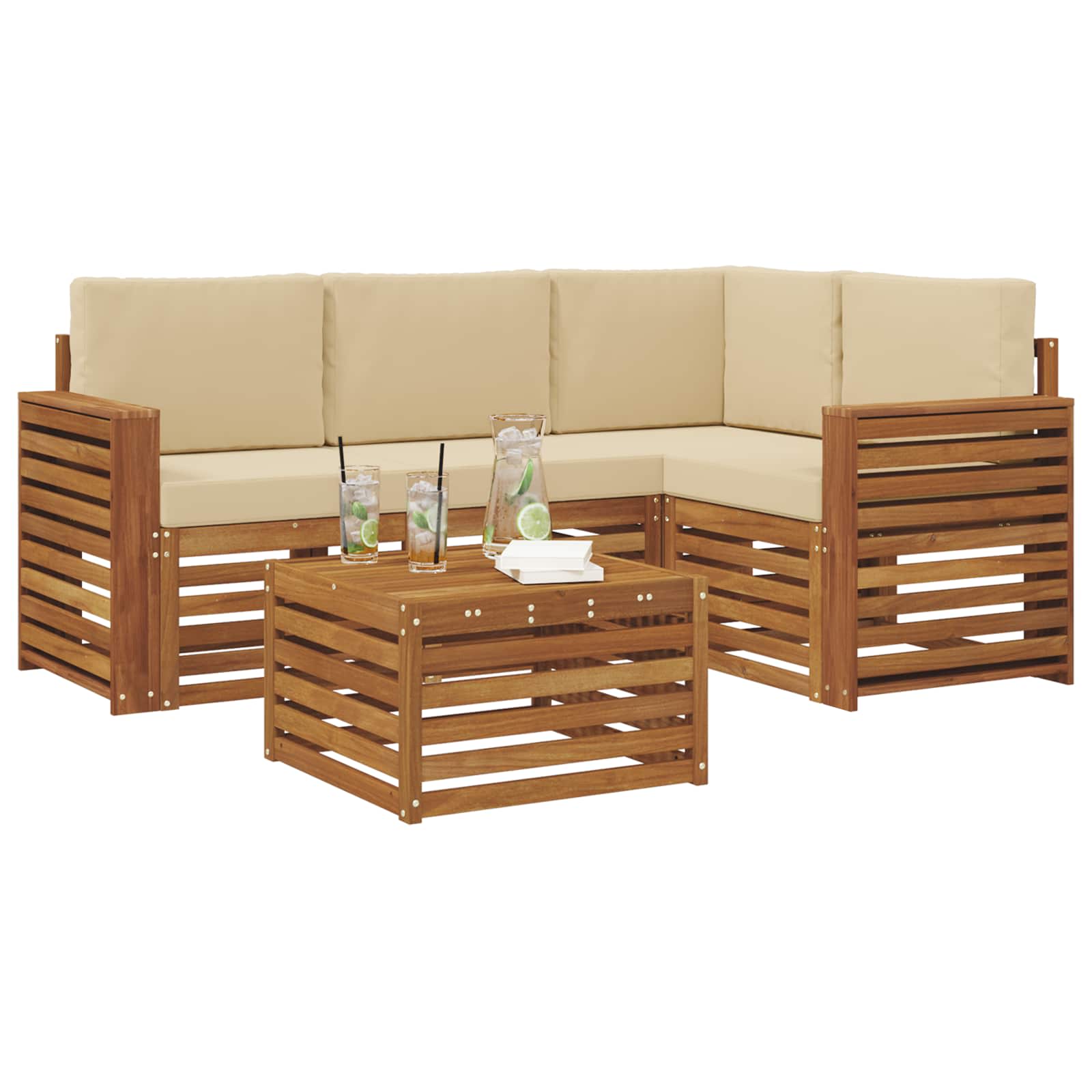 Dieses Outdoor-Sofa-Set vereint stylisches Design und praktische Funktionen und macht jeden Garten, jede Terrasse, jeden Poolbereich oder Hinterhof zum Schauplatz. Hergestellt aus massivem Akazienholz in einem warmen Braunton, strahlt es pure Gemütlichkeit aus. Das modulare Design fördert Kreativität und ermöglicht dir, die Sitzanordnungen easy für verschiedene Events umzugestalten – von gemütlichen Treffen bis hin zu großen Feiern. Material: Das massives Akazienholz sorgt für eine starke und langlebige Sitzlösung für Gartenpartys, Pool-Lounges oder Grillabende im Hinterhof. bekannt für seine tolle Textur und Widerstandsfähigkeit verbindet Akazienholz stylisches Design mit Langlebigkeit und ist perfekt für den Außenbereich. Modulare Konfiguration: Dieses Sofa lässt sich mit verschiedenen Modulen anpassen, um deinem Raum und deinen Vorlieben gerecht zu werden. Egal, ob du die Sofas für lange Gespräche anordnest oder gemütliche Ecken schaffst, die flexible Anordnung steigert die Nutzbarkeit und fördert kreative Ideen. Stylische Armlehnen: Jedes Stück hat Armlehnen aus Akazienholz, die den modernen Look unterstützen und für bequemen Sitz bieten. Ob du ein Buch liest oder plauderst, diese Armlehnen bringen dich zur Entspannung. Designmerkmale: Die modernen, geschlitzten Oberflächen machen das Möbelset echt attraktiv. Das schlichte Design passt super zu bestehenden Außenmöbeln und sorgt für die notwendige Luftzirkulation, was besonders an warmen Tagen toll ist. Pflegehinweise: Halte den coolen Look, indem du das Set einfach mit einem feuchten Tuch abwischst. So bleibt es nicht nur stylisch, sondern auch eine leichte Ergänzung für deinen Außenbereich.
