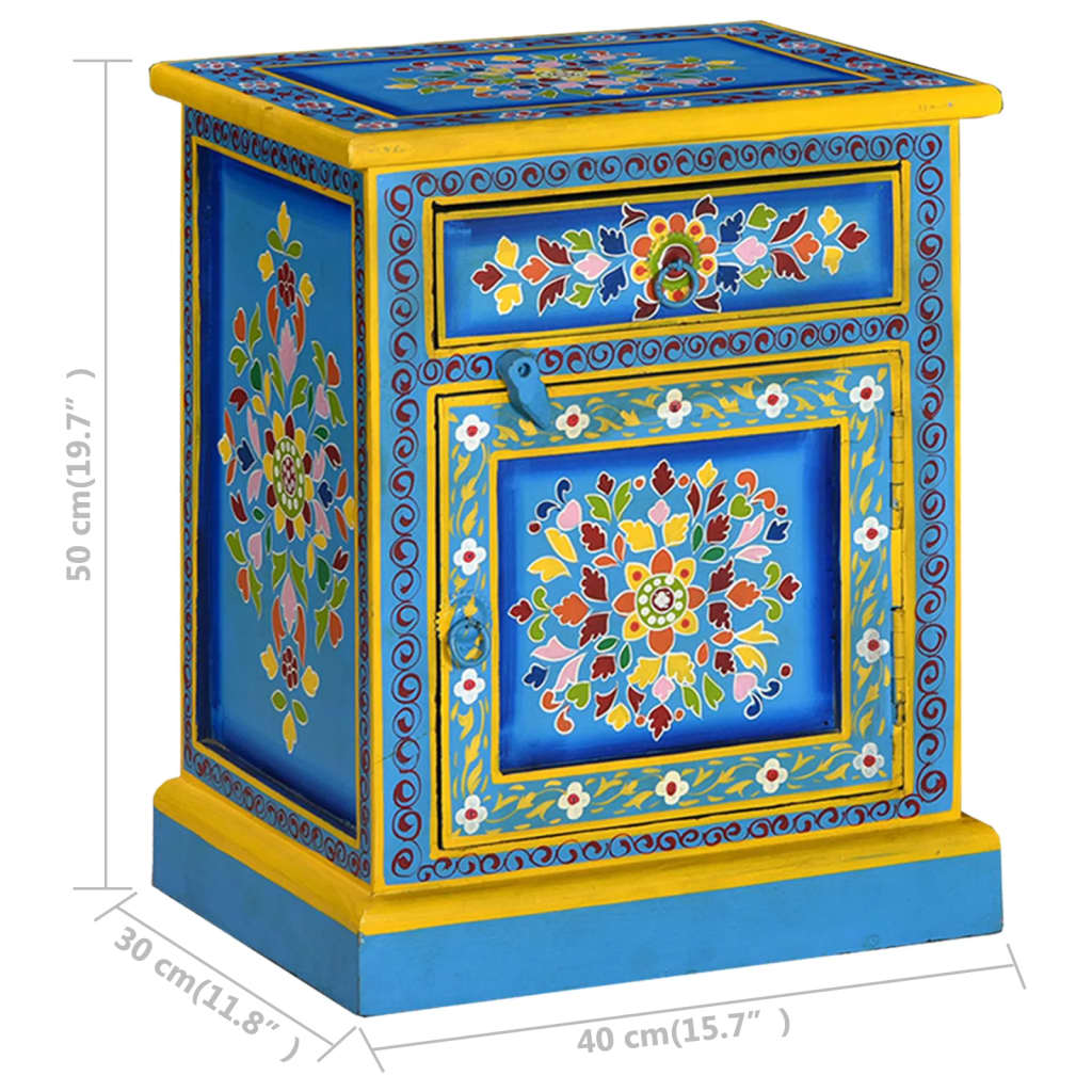 Dieser einzigartige Nachttisch aus Holz verleiht deinem Schlafzimmer eine farbenfrohe Note und erweckt es sofort zum Leben. Der Nachttisch ist aus Mangoholz handgefertigt, das robust und optisch ansprechend ist. Die Handwerkskunst trägt zu seinem spektakulären Retro-Stil bei. Jeder Schritt des Fertigungsprozesses wird mit größter Sorgfalt ausgeführt, sei es Polieren, Anstreichen oder Lackieren. Der Nachttisch verfügt über aufwendige, handbemalte, dekorative Details, die einen besonders lebendigen und einladenden Effekt erzeugen. Der Nachttisch besitzt eine robuste Oberplatte, auf der eine Leselampe, einen Wecker oder andere Sachen, die du neben dem Bett halten möchtest, Platz finden. Die Schublade und das Fach bieten reichlich Stauraum, um verschiedene Kleinigkeiten organisiert und griffbereit aufzubewahren. Die einzigartigen Griffe erleichtern das Öffnen der Schublade und der Tür und tragen zum markanten Design des Nachttisches bei. Darüber hinaus ist der Nachtschrank mit einem Riegel versehen, der das Abschließen der Tür ermöglicht. Der Artikel ist bereits zusammengebaut; eine Montage ist daher nicht erforderlich.