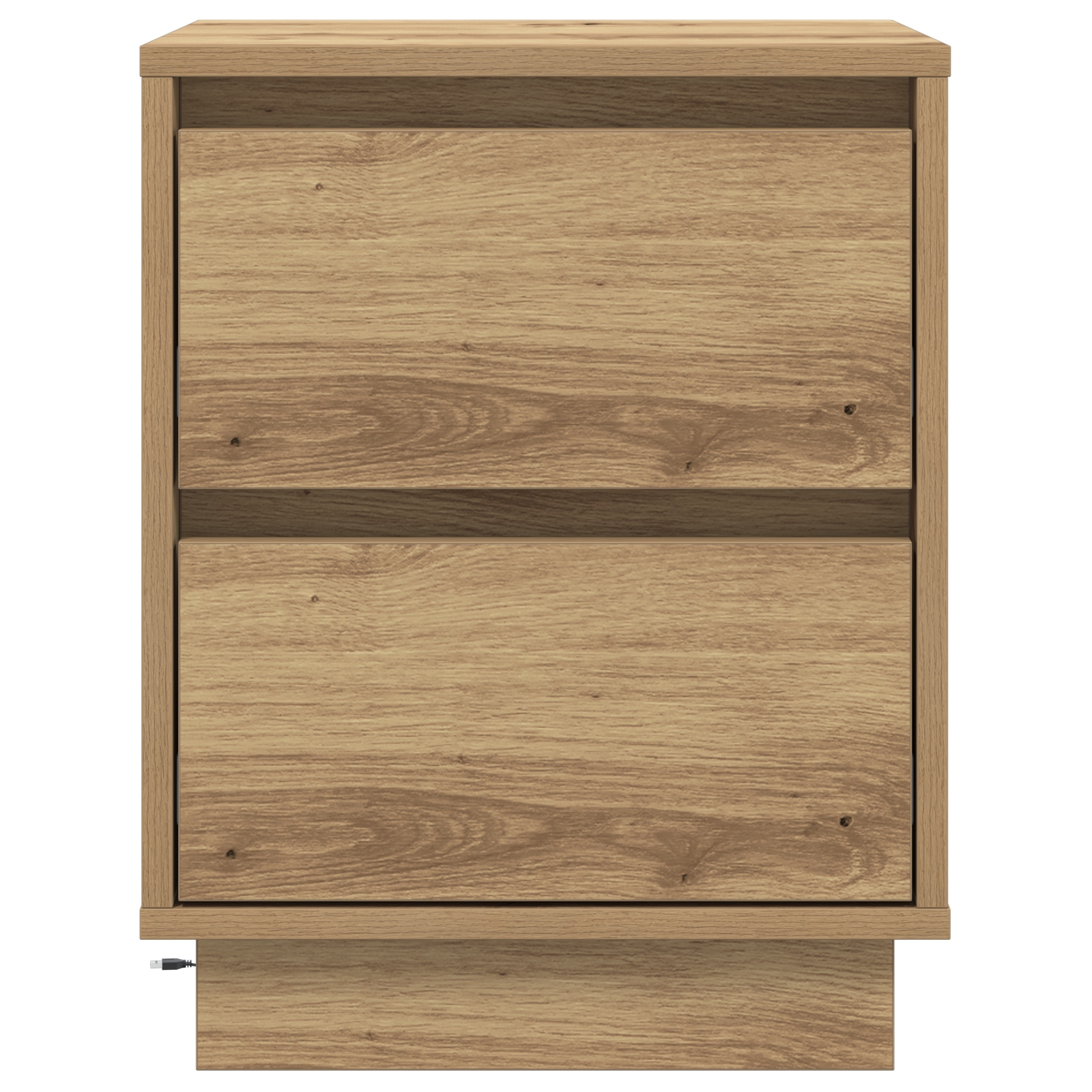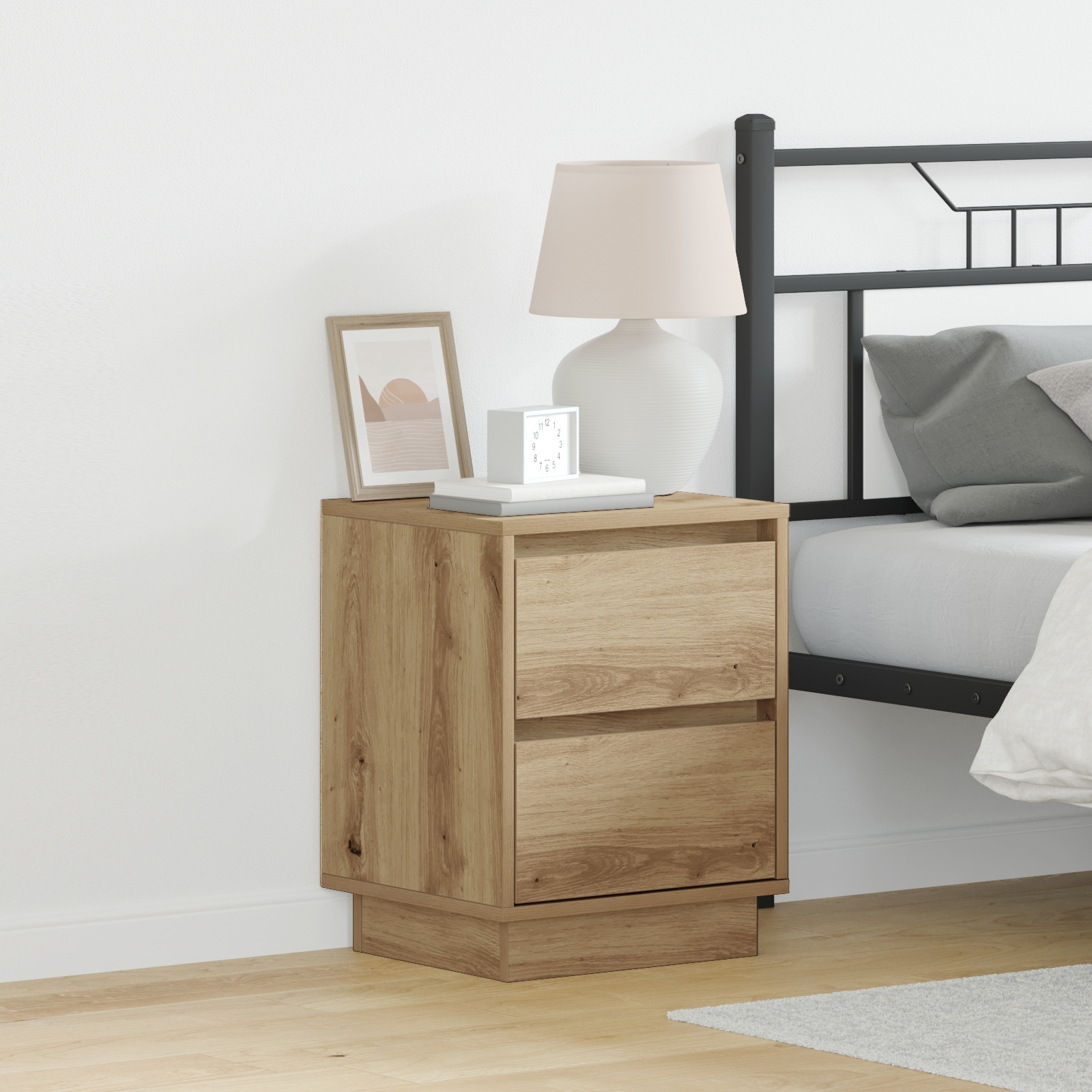 Dieser Nachttisch kombiniert modernen Stil mit praktischem Nutzen und ist ein Must-Have für jedes Schlafzimmer. Sein cooles Artisan-Eichen-Design sieht nicht nur toll aus, sondern bietet auch die perfekte Fläche, um deine wichtigen Sachen griffbereit zu halten und macht dein Zimmer ordentlicher und stilvoller. LED-Lichtstreifen: Mit einem coolen blauen LED-Lichtstreifen bringt dieser Nachttisch eine besondere Stimmung in dein Schlafzimmer, ideal für nächtliche Aktivitäten. Das integrierte Licht sorgt nicht nur für Helligkeit, sondern auch für eine gemütliche Atmosphäre zum Entspannen. Sanftschließende Schubladen: Die Schubladen gleiten leise zu, wodurch Störungen in der Nacht minimiert werden. Mit dieser Funktion kannst du ruhig schlafen und hast alles Wichtige griffbereit. Modernes Design: Mit seiner glatten, matten Artisan-Eichen-Oberfläche und klaren Linien ist dieser Nachttisch ein Paradebeispiel für modernes Wohnen. Sein vielseitiger Stil passt zu vielen Schlafzimmerdesigns, von minimalistisch bis zeitgenössisch. Optimaler Stauraum: Mit zwei großzügigen Schubladen ist dieser Nachttisch genau richtig, um persönliche Dinge, Bücher oder Nachtsachen ordentlich zu verstauen und deinen Raum aufgeräumt zu halten. Einfache Montage: Dieser Nachttisch ist schnell und einfach aufzubauen, sodass du deine neuen Möbel ohne großen Aufwand nutzen kannst. Er braucht zwei Personen und nur einen Schraubendreher, und der Aufbau dauert etwa 45 Minuten.