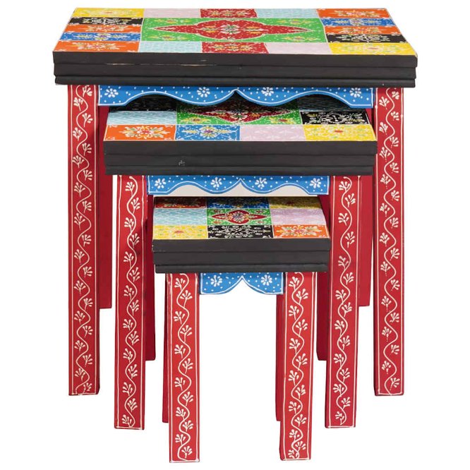 Dieses Nesting-Tischset hat ein auffälliges mehrfarbiges Design, das jeden Bereich mit einer lebendigen Note aufwertet. Mit seiner quadratischen Form und der künstlerischen, handbemalten Oberfläche schafft es eine gemütliche Atmosphäre und ist eine tolle Wahl für Boho-Liebhaber. Elegantes Design: Die hellen Farben und das geometrische Muster sorgen dafür, dass dieser Tisch in jedem Raum ins Auge fällt und eine lebendige Atmosphäre schafft. Kunstfertigkeit: Jeder Tisch hat einzigartige handgemalte Details, die die Handwerkskunst zeigen und diese Tische zu funktionalen und künstlerischen Stücken machen. Robuste Konstruktion: Aus Naturholz gefertigt, sind diese Tische langlebig und stabil, sodass sie nicht nur schön, sondern auch für den täglichen Gebrauch geeignet sind. Einfache Integration: Das anpassungsfähige Design ermöglicht es diesem Tisch, in verschiedene Einrichtungsstile zu passen, von modern bis klassisch, und sich mühelos in deinen Raum zu fügen. Kompakte Größe: Ideal für kleinere Bereiche sind diese Nesting-Tische ausgezeichnete Akzentstücke, die zusätzlichen Platz schaffen, wann immer nötig, sei es für Getränke, Dekoration oder Kunst.