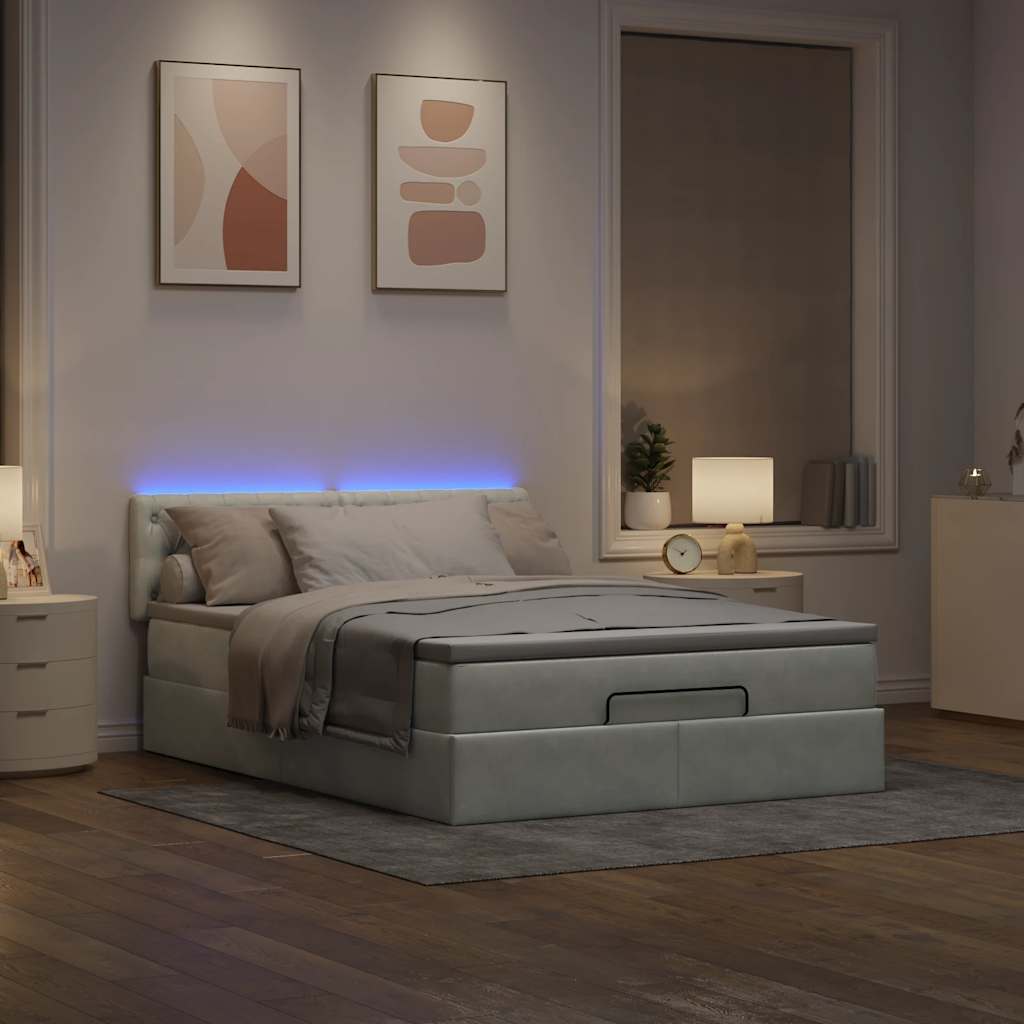 Genieße mit diesem Ottomanbett mit Matratze eine erholsame Nachtruhe! Es bietet dir sowohl eine Stauraumlösung als auch ein komfortables Schlaferlebnis. Weiches und komfortables Material: Der Samtstoff hat eine weiche und sanfte Oberfläche, die sich angenehm auf der Haut anfühlt und höchsten Komfort bietet.Taschenfederkernmatratze: Diese Matratze hat einzelne Taschenfedern, die unabhängig voneinander arbeiten. Somit bietet sie dir optimalen Halt, indem sie auf Druckstellen in jedem Bereich unabhängig reagieren. Diese Konstruktion verhindert das "Zusammenrollen" und reduziert die Bewegungsübertragung im Vergleich zu alten Federkernmatratzen. Jede Taschenfeder stützt die Körper-Druckstellen individuell.Großer Stauraum unter dem Bett: Dank des hydraulischen Hebemechanismus bietet der Bettrahmen reichlich Stauraum unter dem Bett, sodass der Platz maximiert wird, ohne zusätzliche Bodenfläche zu beanspruchen. Mit einem einfachen Zug am Griff hebt sich der Lattenrost sanft an, sodass du deine Gegenstände schnell und mühelos herausholen kannst.Komfortable Matratzenauflage: Die Auflage verbessert den Halt und den Komfort mit ihrer weichen, atmungsaktiven Oberfläche und verlängert gleichzeitig die Lebensdauer deiner Matratze. Der abnehmbare Bezug ermöglicht ein einfaches Waschen, was die Pflege der Matratze zum Kinderspiel macht.LED-Beleuchtung für ein angenehmes Ambiente: Dieses Bett verfügt über LED-Leuchten, die einfach eingestellt werden können, um eine persönliche Lichtshow zu kreieren. Du kannst die Modi, Farben und Helligkeit anpassen, um das Ambiente in deinem Wohnraum zu verbessern. Gut zu wissen:Das Produkt verfügt über einen USB-Anschluss, für den eine zertifizierte 5V-USB-Stromquelle erforderlich ist (nicht im Lieferumfang enthalten).Aus hygienischen Gründen kann die Matratze nicht zurückgegeben werden, wenn die Verpackung entfernt oder geöffnet wurde.Nur der Teil mit dem Symbol kann geschnitten werden und nur der Teil mit dem USB funktioniert auch weiterhin.