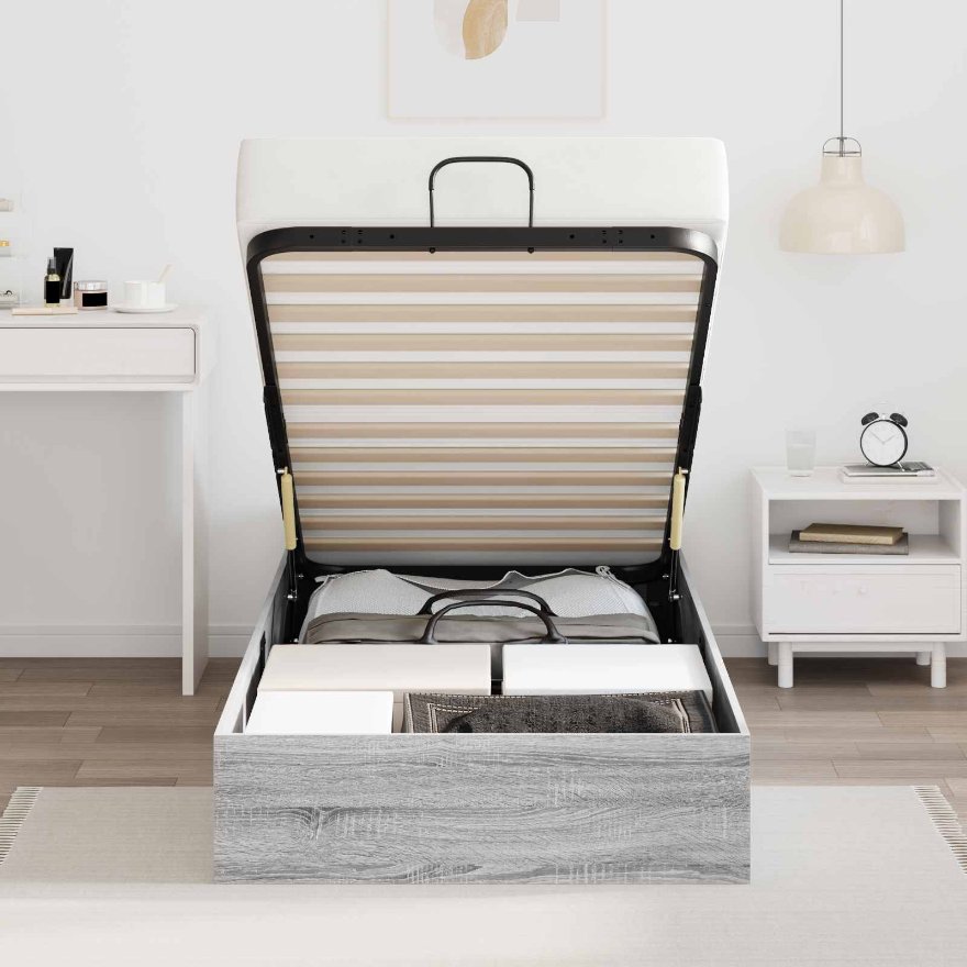 Dieses moderne Ottoman-Bettgestell kombiniert Style und Funktionalität und verwandelt dein Schlafzimmer mit klaren Linien und einem eleganten Touch. Es ist ideal für alle, die ihren Wohnraum aufwerten möchten und bietet sowohl praktische Vorteile als auch eine schicke Optik. Genieße den coolen modernen Look, der zu jeder Einrichtung passt. Holzspanplattenkonstruktion: Die stabile Holzspanplatte sorgt für eine langlebige Struktur und eine glatte Oberfläche, die perfekt für Schlafzimmermöbel geeignet ist. Gasliftmechanismus: Der praktische Gaslift hebt die Matratze mühelos, sodass du leicht zum Stauraum darunter kommst. So ist es super bequem und minimiert die Belastung. Geräumiger Stauraum: Mit viel Platz unter dem Bett ist dieser Rahmen perfekt, um Bettwäsche, Kleidung oder andere Dinge ordentlich zu verstauen und den Raum aufgeräumt zu halten. Modernes geometrisches Design: Die quadratischen Griffe an beiden Enden geben dem Bett einen trendigen Look und passen zu verschiedenen Schlafzimmerstilen. Einfache Montage: Der Aufbau ist einfach und du brauchst nur zwei Personen und einen Schraubendreher, was es für die meisten Leute leicht macht.