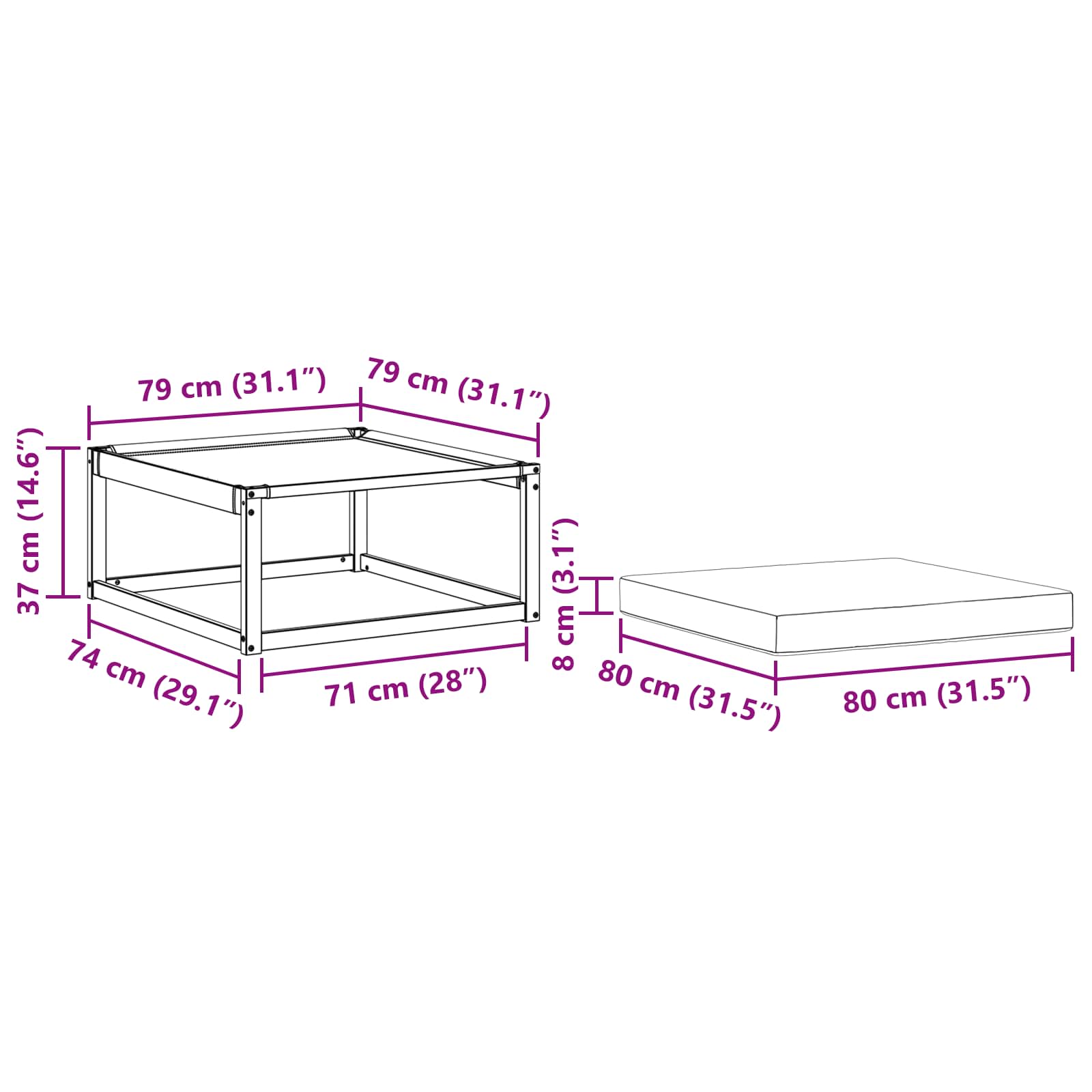 - 1 x Fußhocker: 79 x 79 x 37 cm (LxBxH)