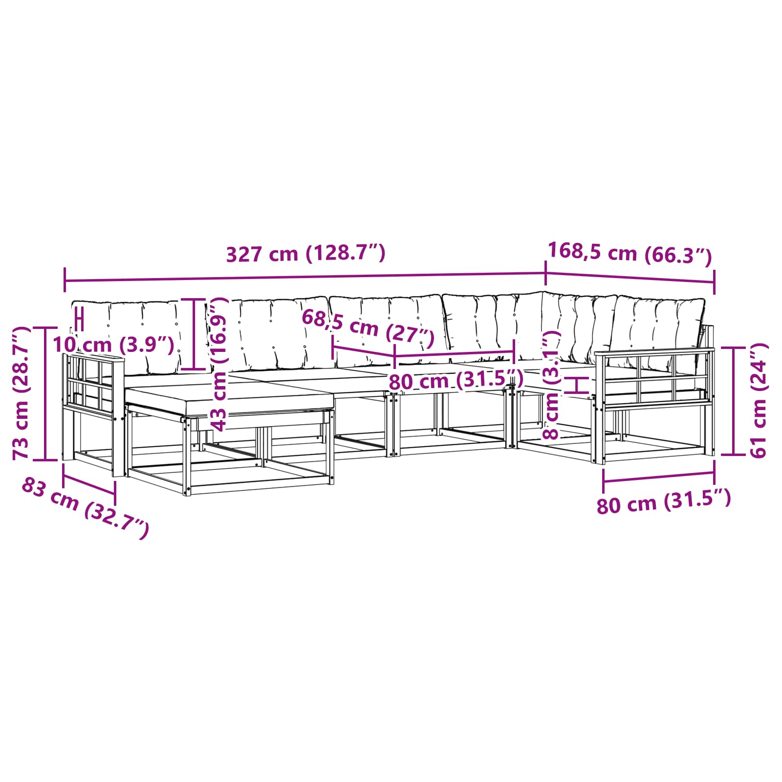 - Gesamtabmessungen: 327 x 168,5 x 73 cm (L x B x H)