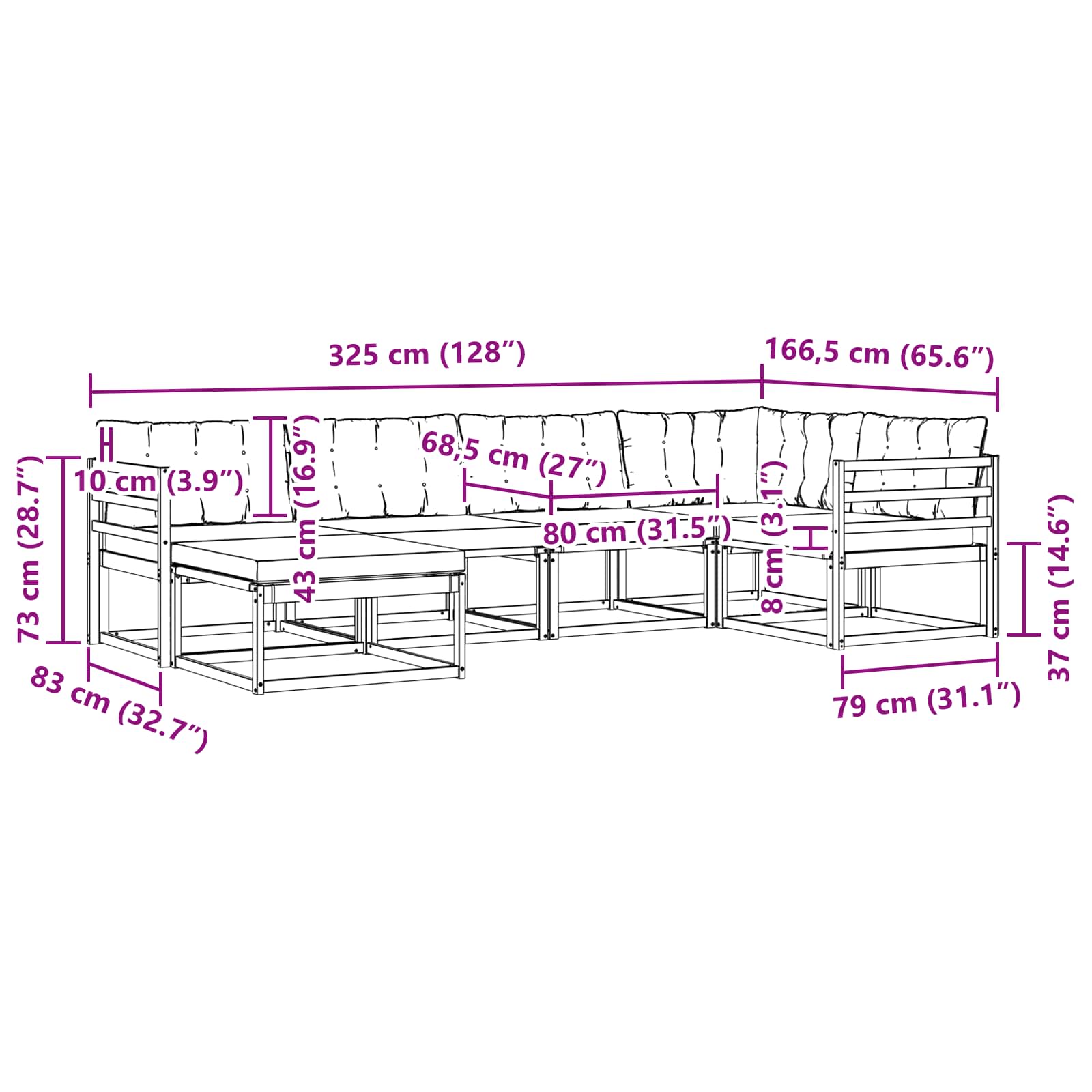 - Gesamtabmessungen: 325 x 166,5 x 73 cm (L x B x H)