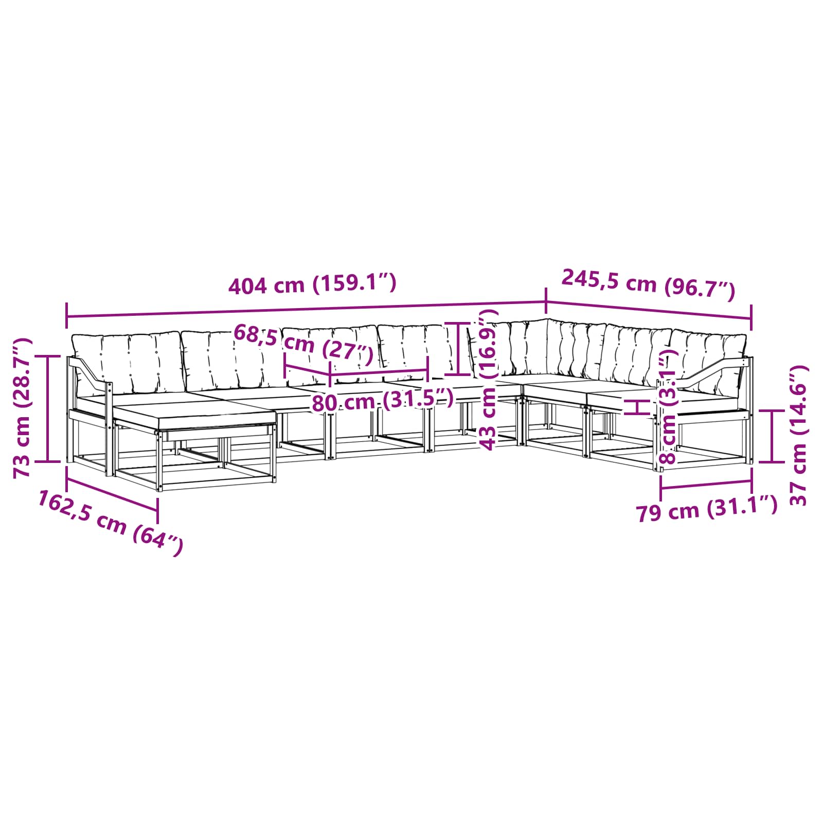 - 8 x Rückenkissen: 80 x 43 x 10 cm (LxBxH)