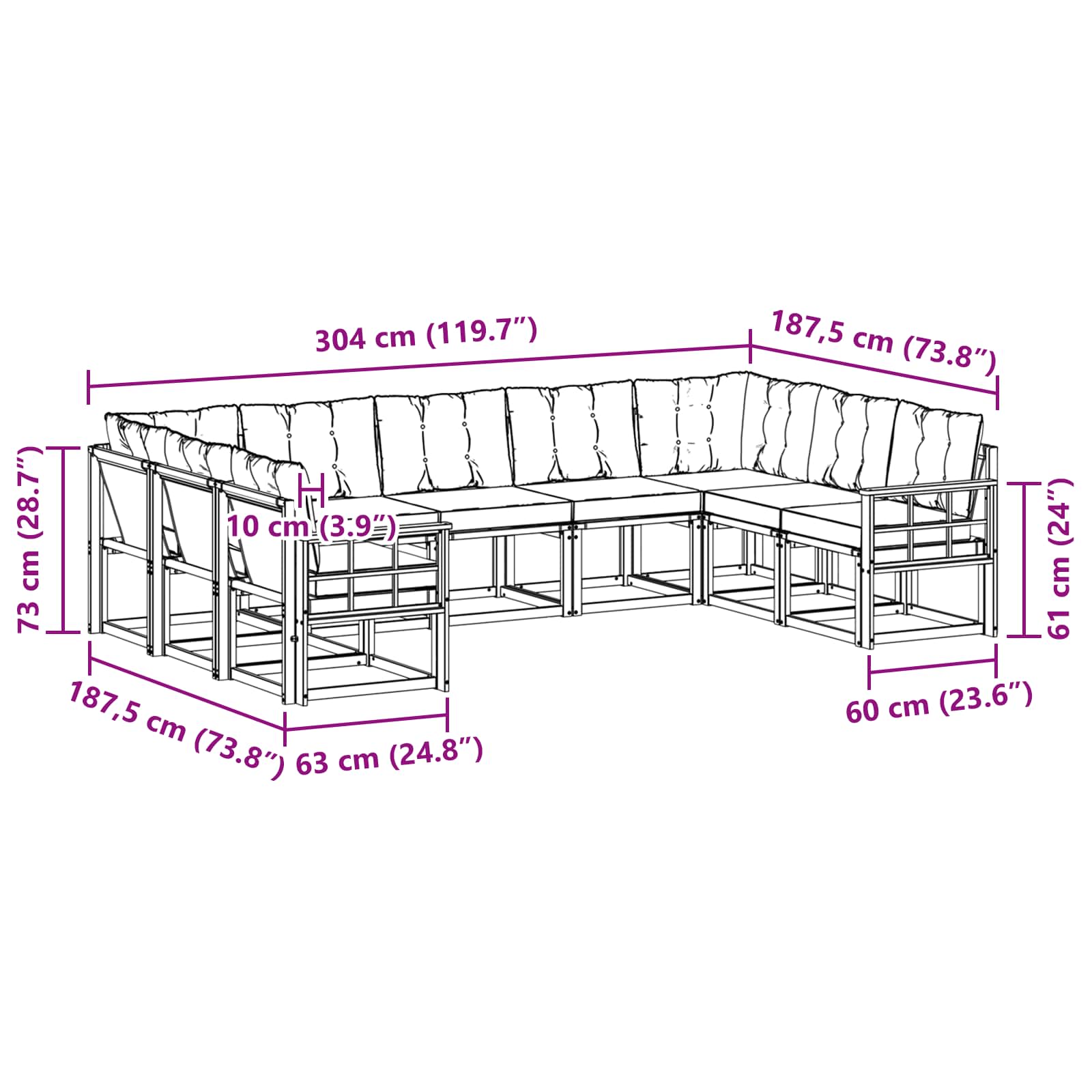 - Gesamtabmessungen: 304 x 187,5 x 73 cm (L x B x H)