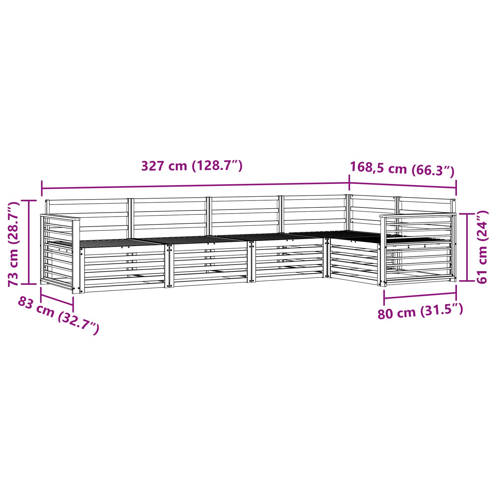 - Gesamtabmessungen: 327 x 168,5 x 73 cm (L x B x H)