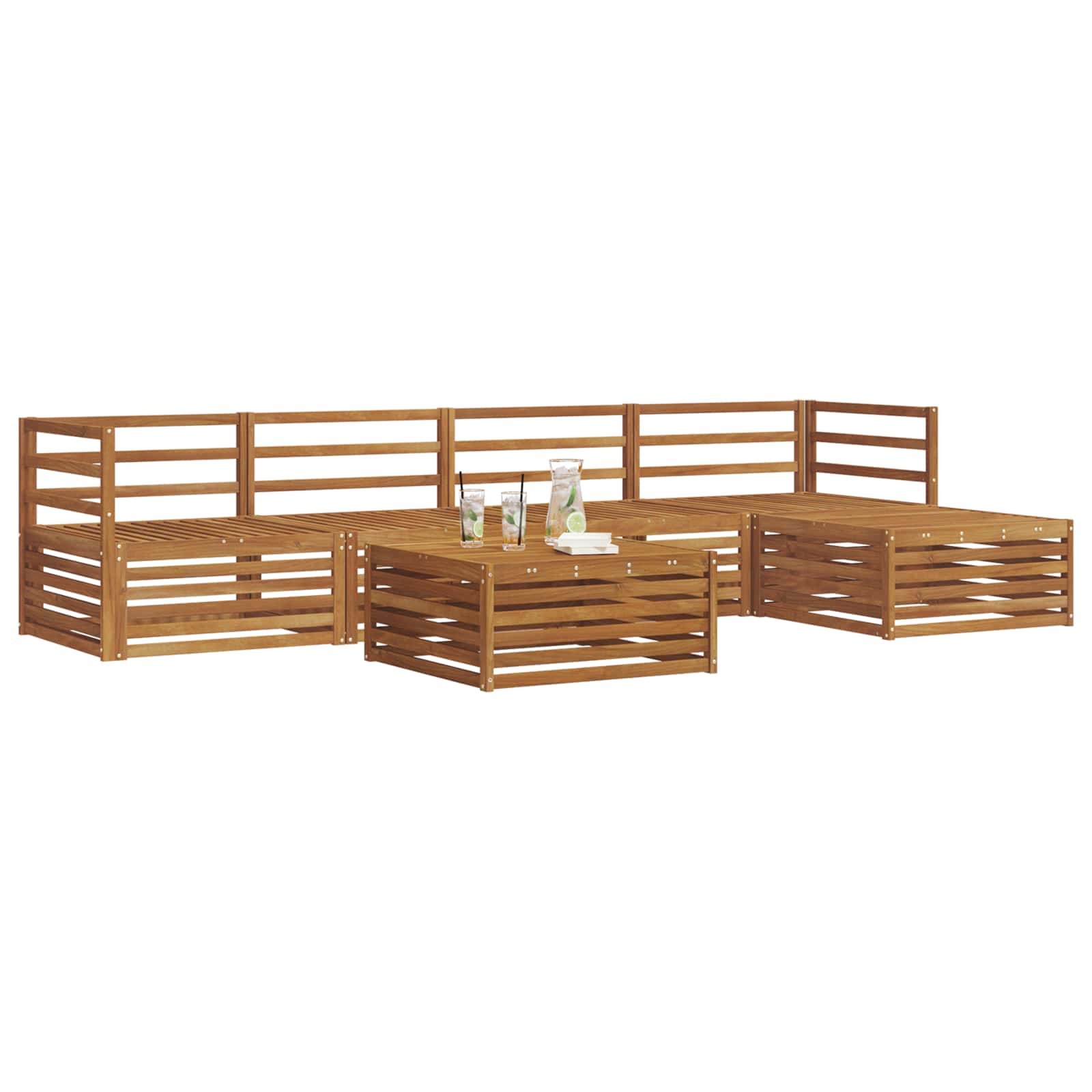 Das Outdoor-Möbelset kombiniert Stil und Funktion mit einem echten Hingucker für deinen Garten oder deine Terrasse. Das moderne Design mit klaren Linien und wenig Schnickschnack verleiht eine elegante Note, die besten für entspannte Stunden draußen und gesellige Runden geeignet ist. Aus massivem Akazienholz gefertigt, ist das Set stabil und sieht auch nach längerer Zeit noch toll aus, was es zur perfekten Wahl macht, wenn du schöne und praktische Gartenmöbel suchst. Langlebiges Massivholz Akazie: Das Outdoor-Möbelset aus massivem Akazienholz ist bekannt für seine Haltbarkeit und Widerstandsfähigkeit gegen Wetter. Die stabile Bauweise sorgt für sicheren Halt und langfristige Stabilität, während die warmen, natürlichen Töne jeden Garten oder jede Terrasse aufwerten. Wetterfeste Konstruktion: Dieses Möbelset hat eine lackierte Oberfläche, die zusätzlichen Schutz gegen Sonne, leichten Regen und andere Witterungseinflüsse bietet. Die glatte Oberfläche hilft, das Aussehen und die Funktionalität zu bewahren und sorgt dafür, dass es lange in deinem Garten oder auf deiner Terrasse hält. Schickes Design: Jedes Stück, von den Armlehnen bis zu den Rücklehnen, ist stylish und funktional gestaltet. Unterstützende Features bieten zusätzlichen Komfort, während das harmonische Design ein optisch ansprechendes Ensemble kreiert, das für verschiedene Outdoor-Anlässe ideal ist. Komfort & Vielseitigkeit: Das modulare Design erlaubt dir flexible Konfigurationen, die sich deinen Bedürfnissen anpassen. Ob zum Entspannen, geselligem Beisammensein oder stillen Lesen, dieses Set fügt sich mühelos in jede Outdoor-Umgebung ein und sorgt für maximalen Komfort. Einfache Pflege: Halte die Möbel in gutem Zustand, indem du die Oberfläche mit einem feuchten Tuch abwischt. Vermeide aggressive oder scheuernde Reiniger. Regelmäßige Pflege hilft, das Aussehen zu erhalten und die Lebensdauer der Möbel zu verlängern.