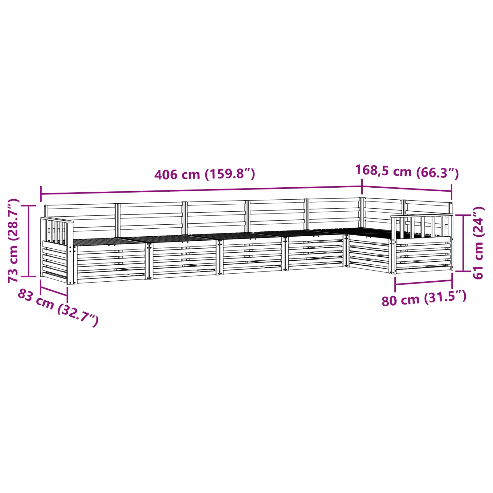 - Gesamtabmessungen: 406 x 168,5 x 73 cm (L x B x H)
