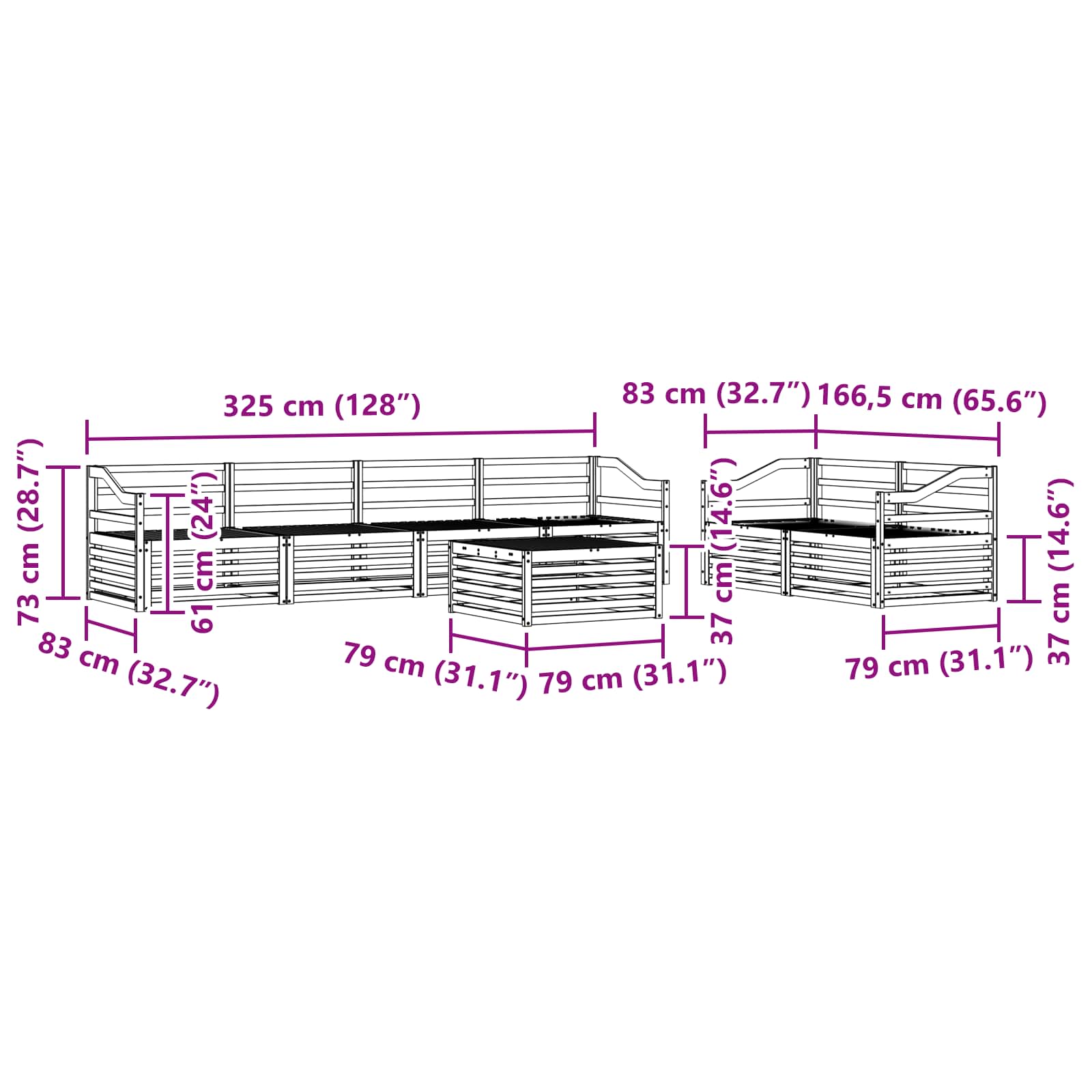 - 6 x Mittelsitz: 79 x 83 x 73 cm (LxBxH)