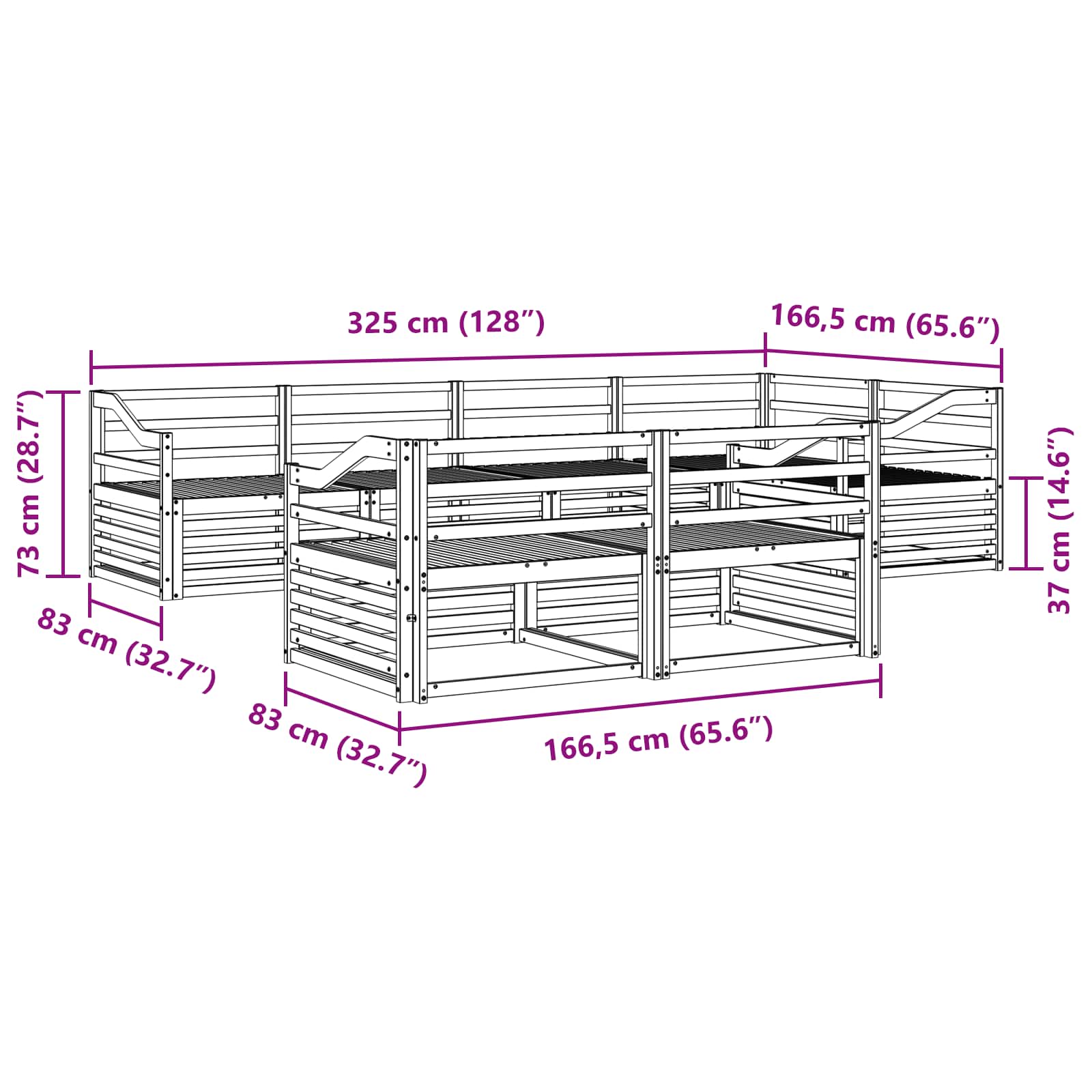 - Gesamtabmessungen: 325 x 166,5 x 73 cm (L x B x H)