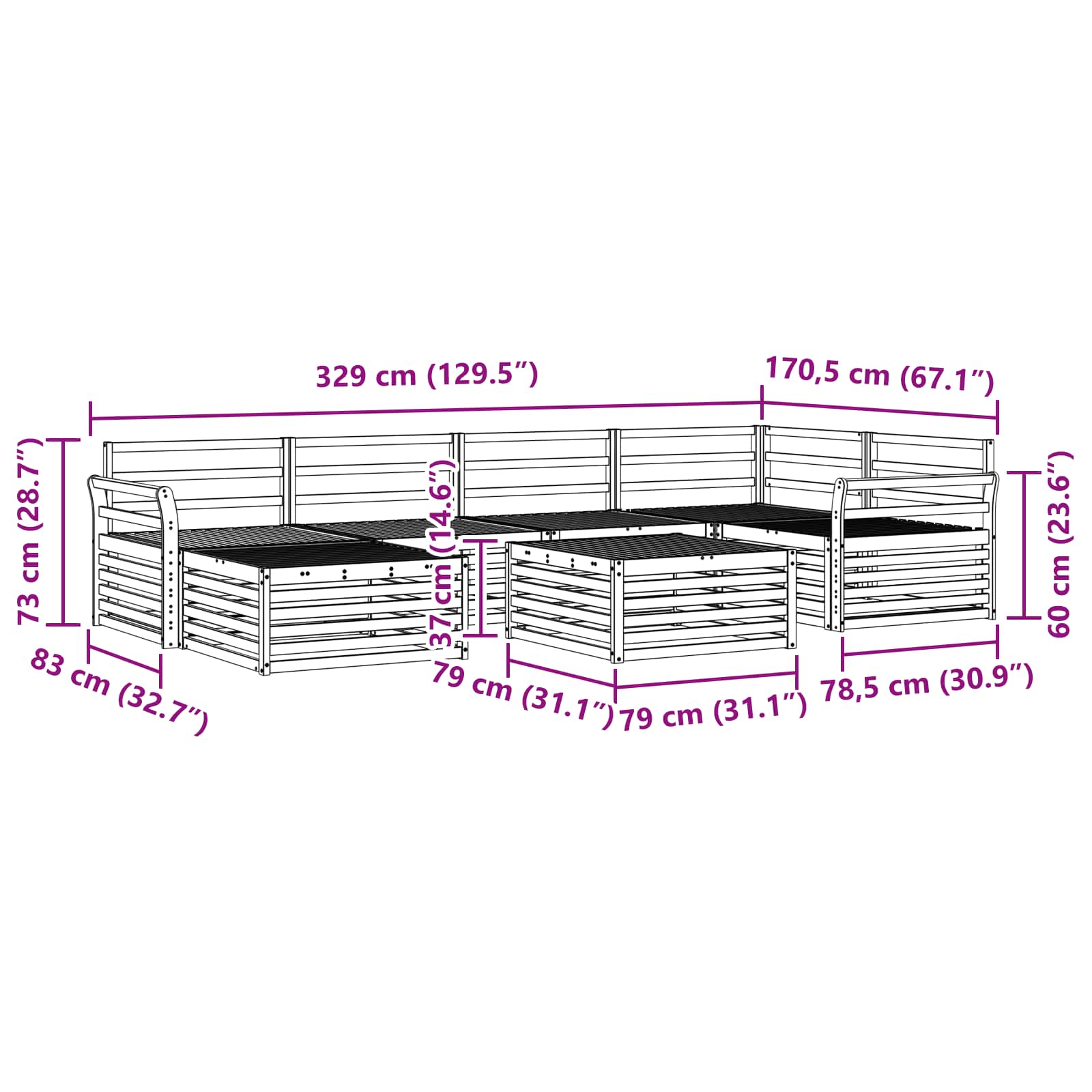 - 4 x Mittelsitz: 79 x 83 x 73 cm (LxBxH)