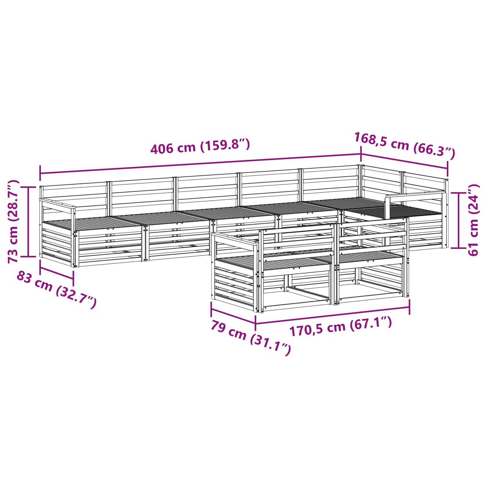 - Gesamtabmessungen: 406 x 168,5 x 73 cm (L x B x H)